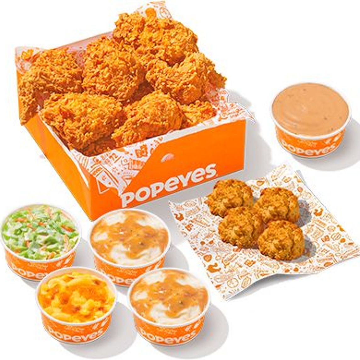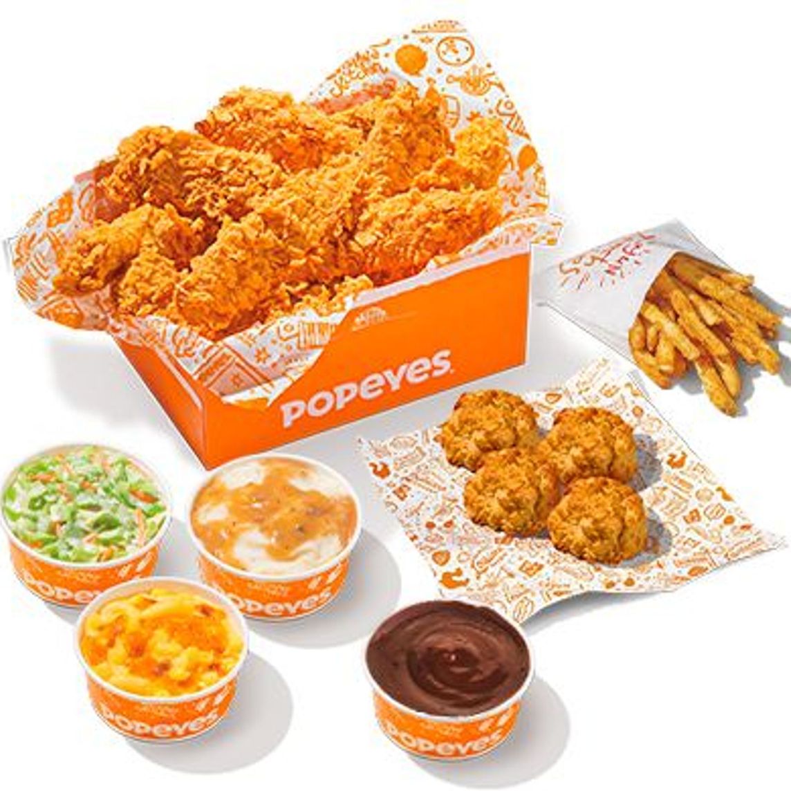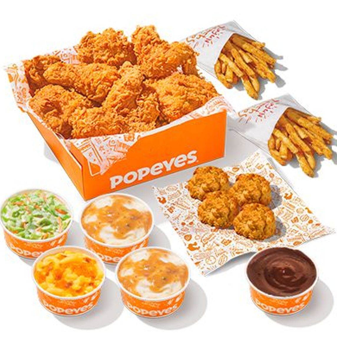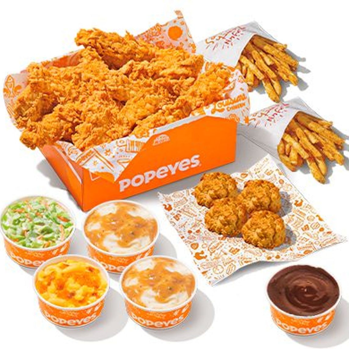 Bayou Familiar: 6 piezas de pollo, 6 Tenders, 4 Pays de manzana, 2 Ensaladas de col regular, 2 Purés de papa regular