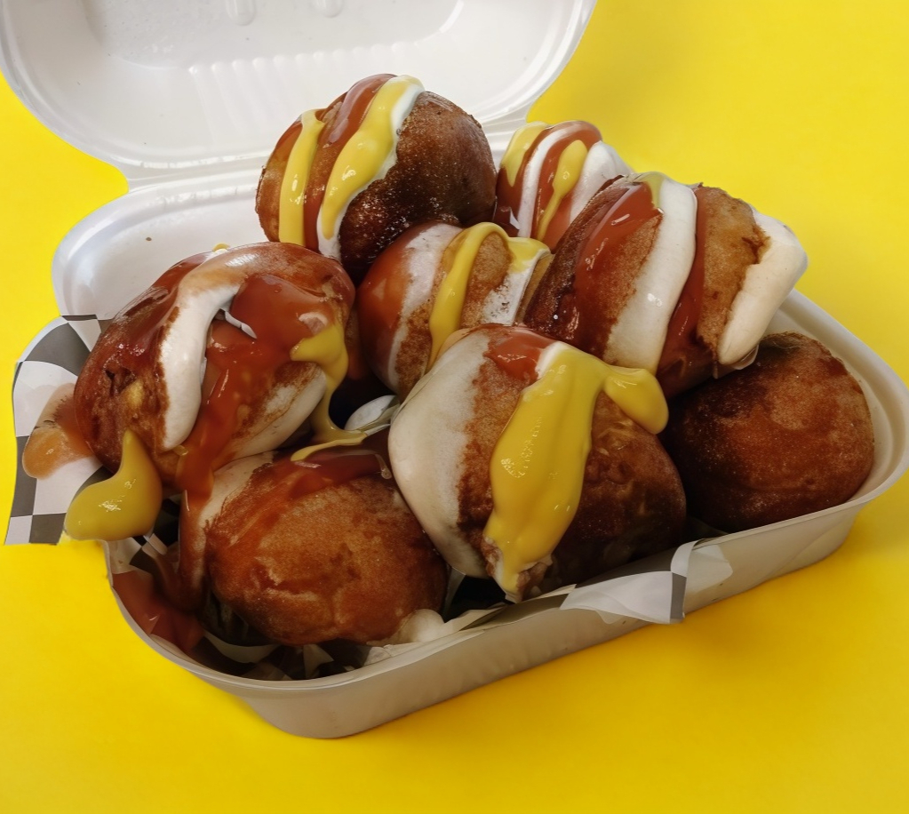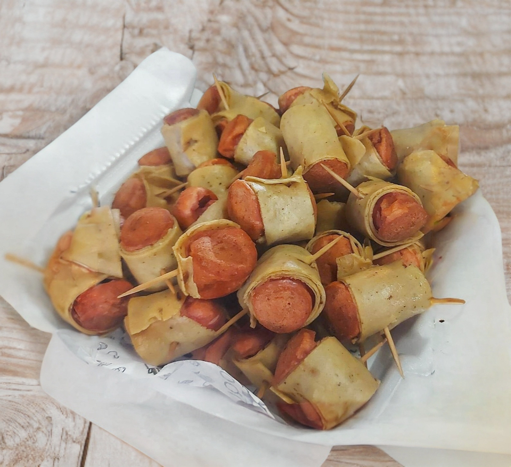 12 bolitas de salchicha envueltas con queso y capeados con una rica pasta