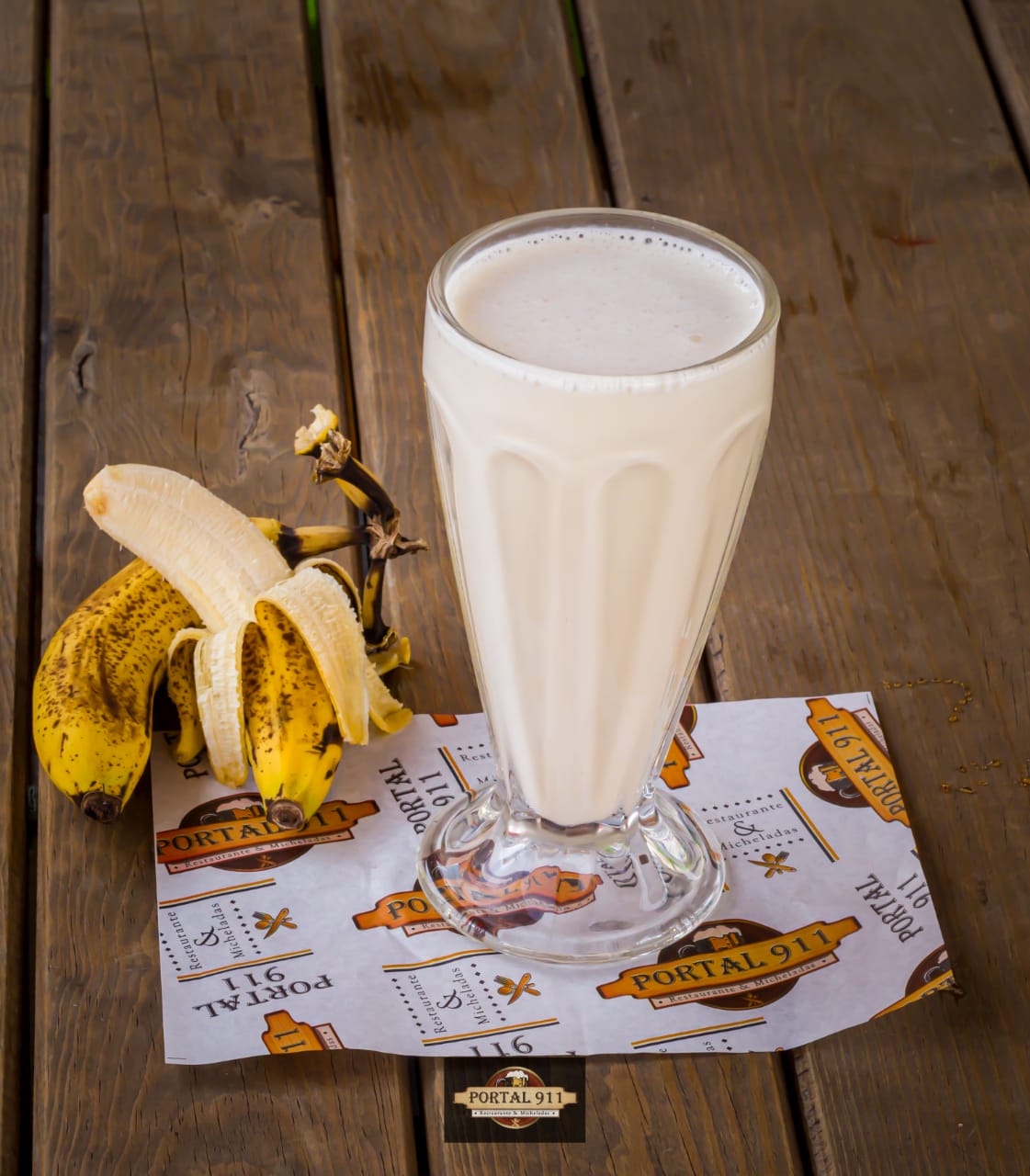 Crema de cacahuete, cocoa, vainilla, plátano y leche.