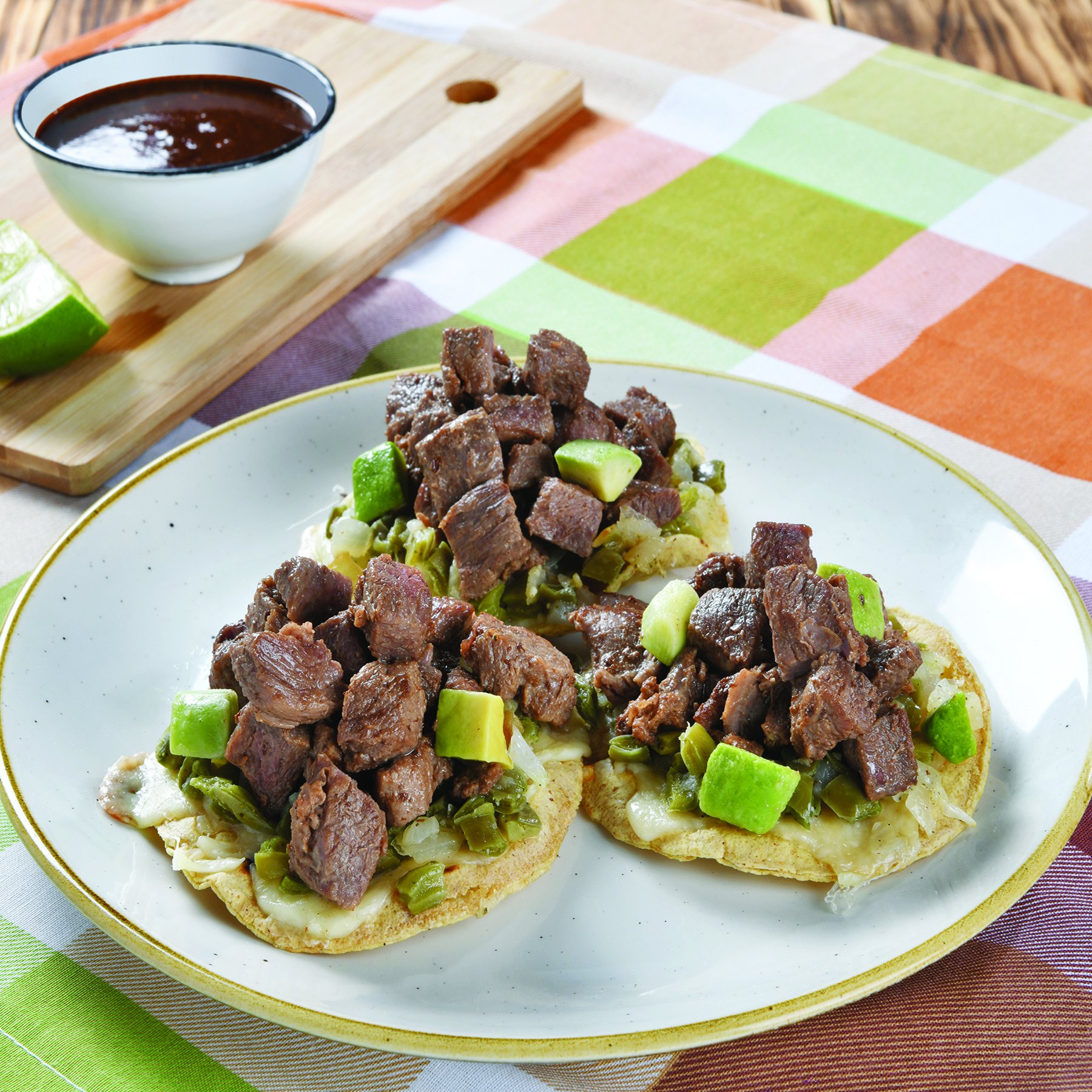 Doble tortilla maíz o harina con 3 quesos gratinado y bistec picado, acompañado de salsa tomate.