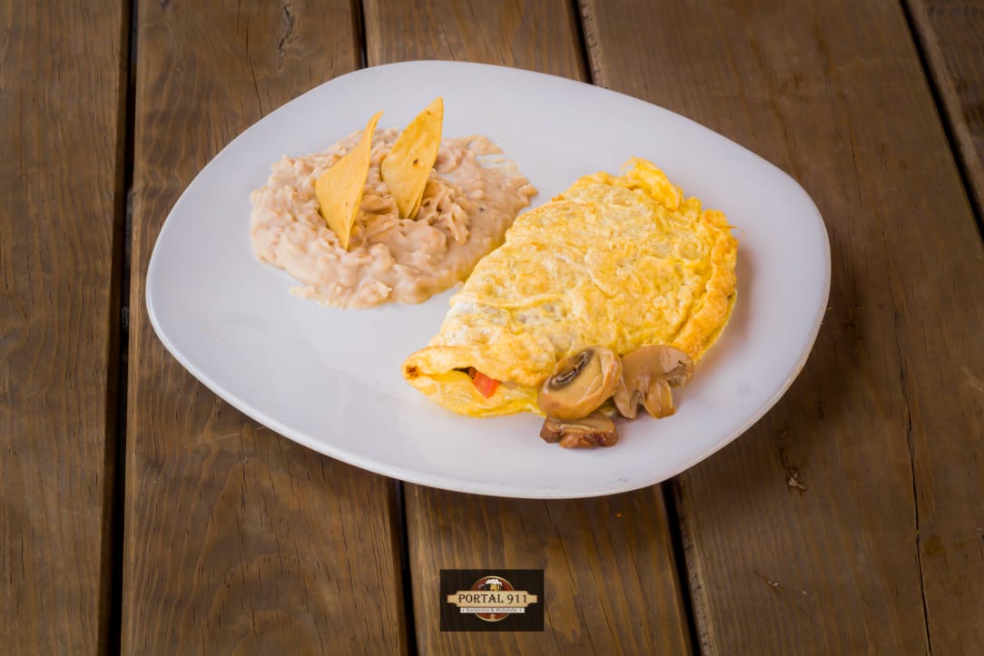 Jamón, queso manchego, salsa mexicana y champiñones, acompañado de frijoles refritos, bolillo con salsa tomate.