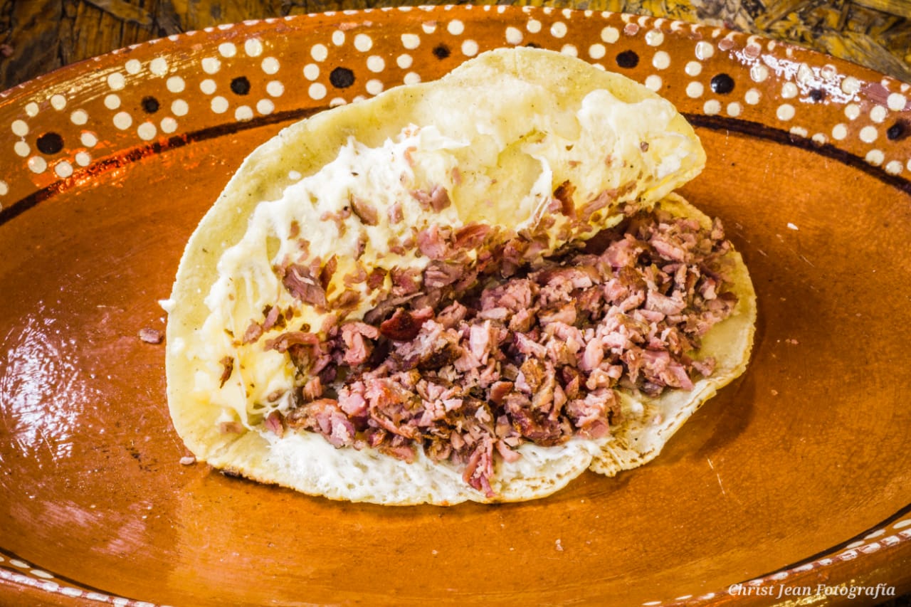 Frijoles, arrachera finamente picada. Acompañada de cilantro, cebolla y salsa de tomate.
