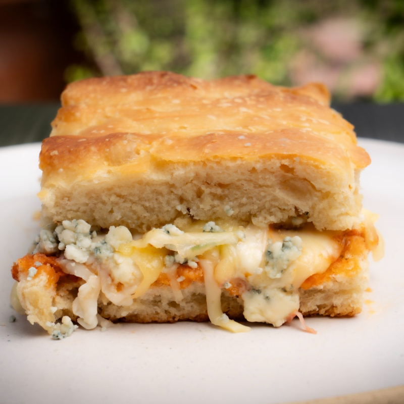 Focaccia de pan hecho en casa con 4 quesos: provolone, gouda, cabra y azul montados en una deliciosa base de salsa pomodoro.