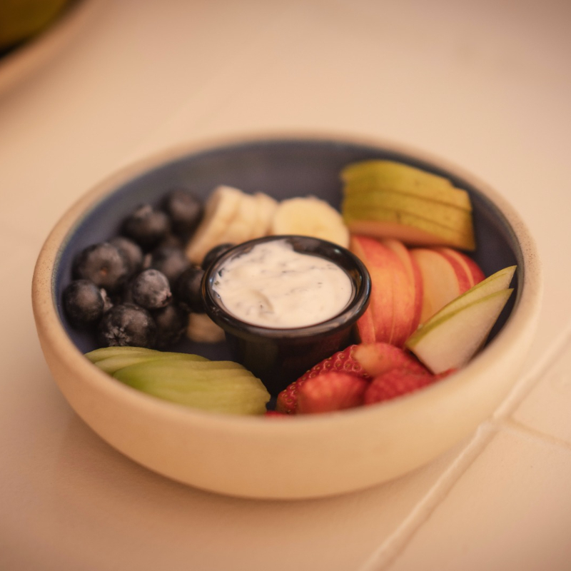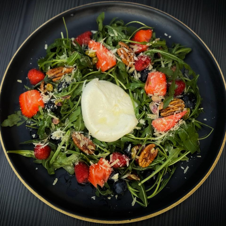 Deliciosa y saludable ensalada con queso burrata al centro acompañada de frutos del bosque, nuez, spring mix, queso parmesano y vinagretas de la casa.