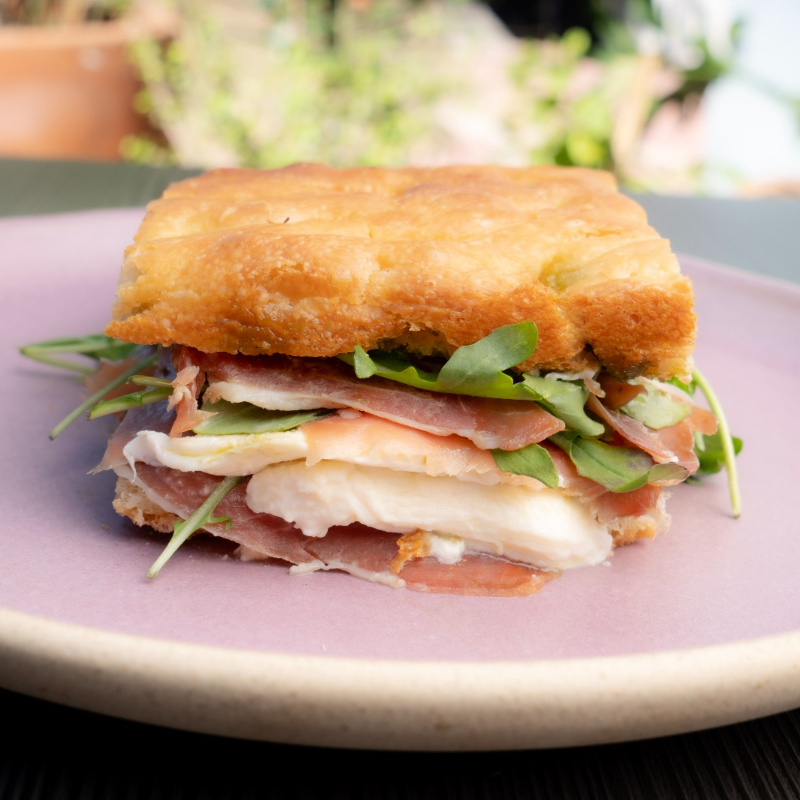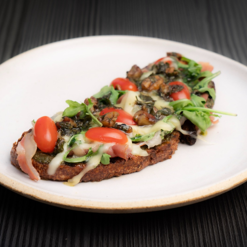 Toast hecho con pan de masa madre, acompañado de prosciutto, mozzarella, tomate cherry, pesto, albahaca y arúgula fresca.