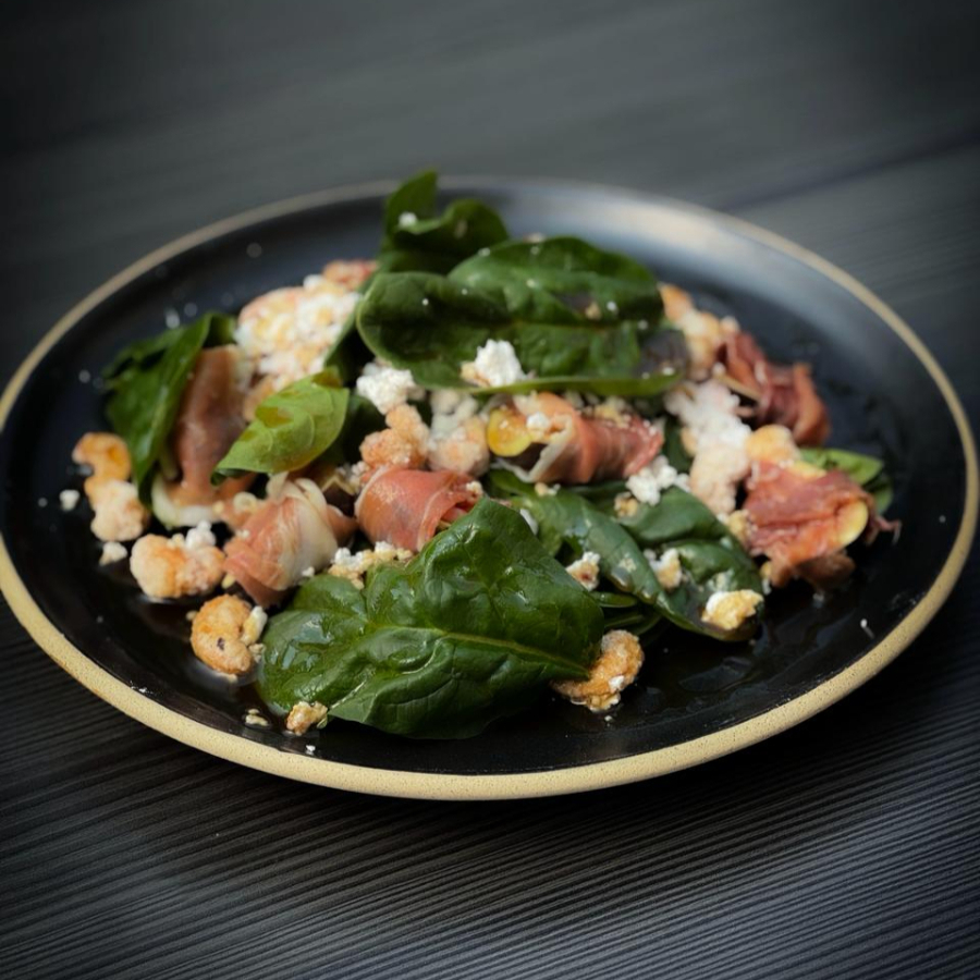 Deliciosa ensalada de prosciutto o jamón serrano, con espinaca, higo, nuez de la india garapiñada, queso de cabra, vinagretas y lechuga sangría.