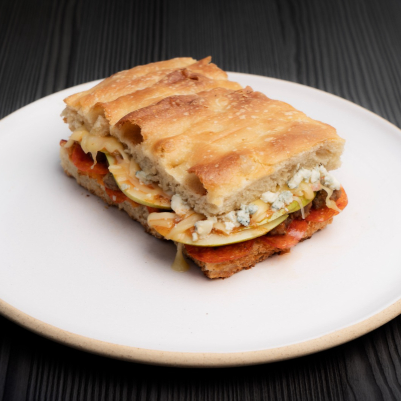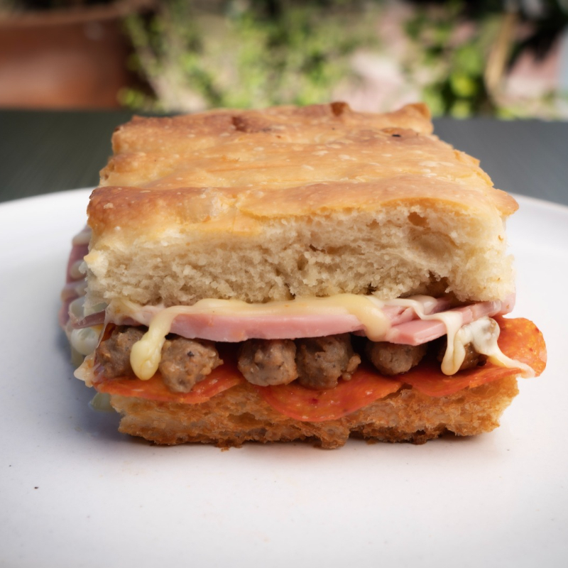 Hecha con pan focaccia de casa, se prepara con salchicha italiana, peperoni, mortadela, chistorra, quesos provole y gouda montado en una basa de deliciosa salsa pomodoro.