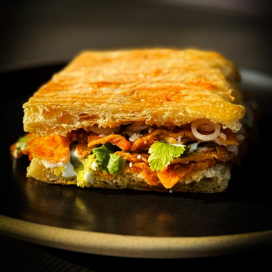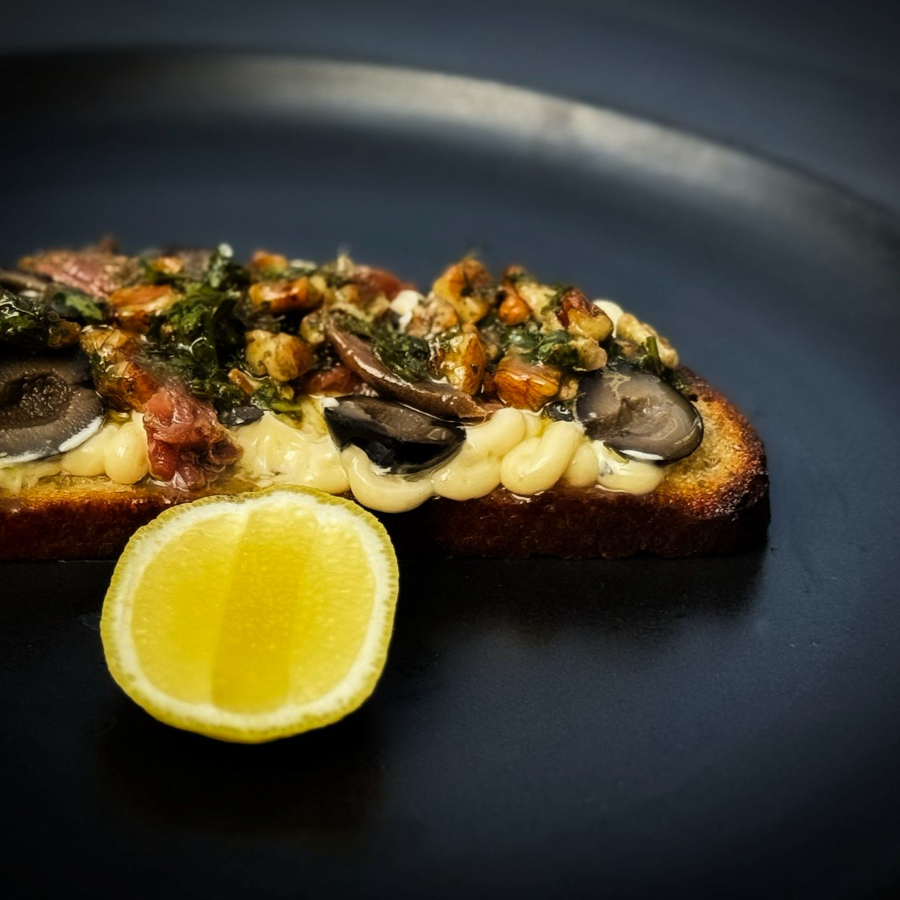 Toast de masa madre servido con anchoas, aderezo de cilantro, aceituna negra, chimichurri, alioli, limón amarillo y queso parmesano