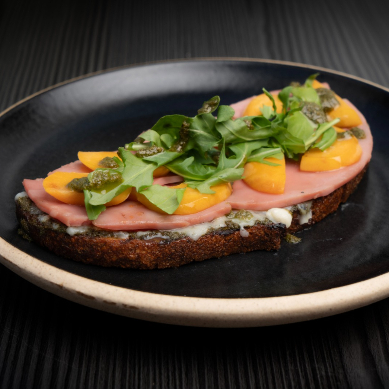 Delicioso toast con pan de masa madre servido con queso brie, durazno, arúgula y miel de abeja natural con una base de pesto