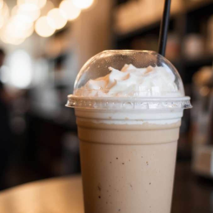 Frappe de espresso con azúcar, leche deslactosada en hielos frapeados.