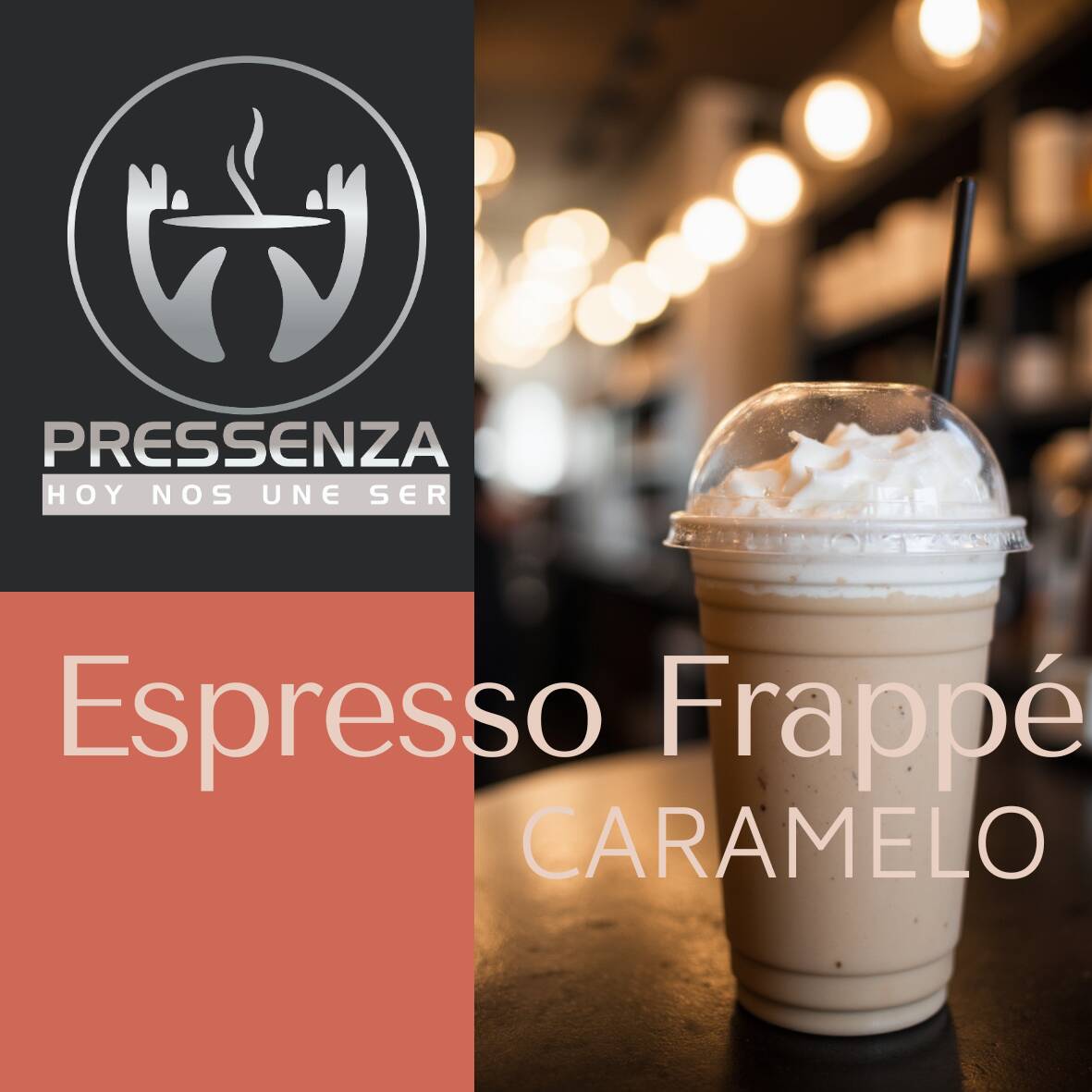Caramelo, espresso, leche deslactosada en hielo triturado, acompañado con crema batida
