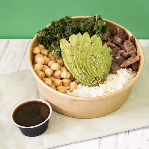 Arrachera jugosa a la plancha sobre arroz blanco, garbanzo salteado, kale fresco y aguacate cremoso, terminado con nuestra salsa teriyaki. Balance perfecto entre proteína y energía.