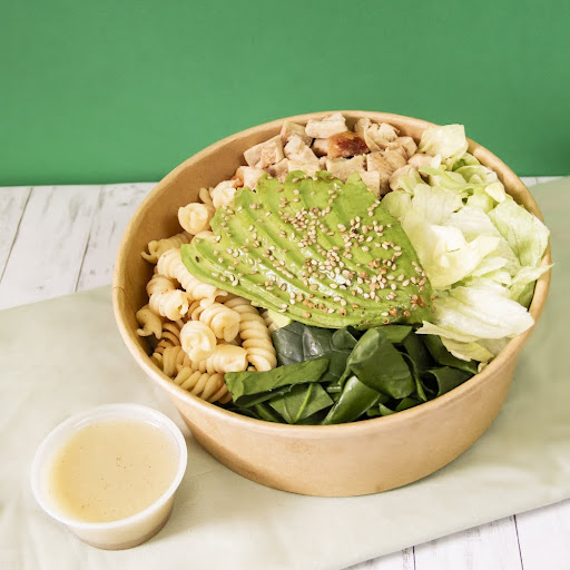 Pollo a la plancha con fusilli, espinaca fresca, cubos de aguacate y ajonjolí tostado, acompañado de una limoneta ligera que realza todo el sabor.