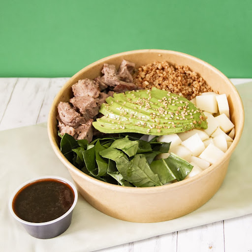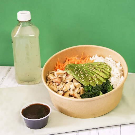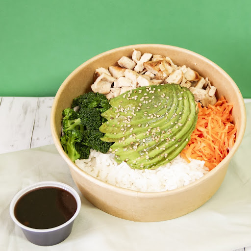 Pollo a la plancha con arroz blanco, brócoli cocido, zanahoria rallada, aguacate y ajonjolí tostado, terminado con salsa teriyaki. Fresco, nutritivo y súper completo.