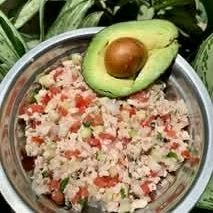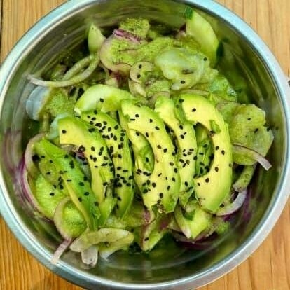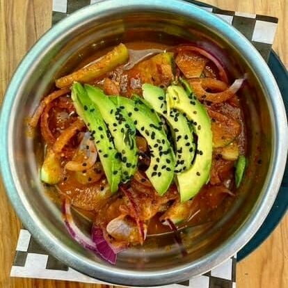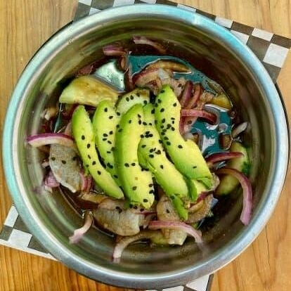 Cubitos de atún fresco, con cebolla morada y pepino, lista para bañarla a tu gusto en salsas negras con chile serrano