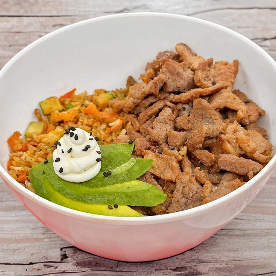 Arroz blanco cocido con aguacate y philadelphia como decoracion y la proteina de su eleccion.
