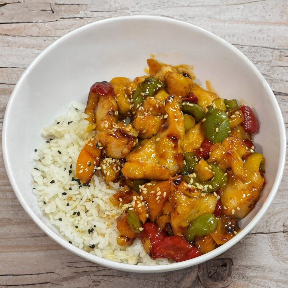 Arroz frito con calabaza, zanahoria y cebollin, con la proteina de su eleccion.