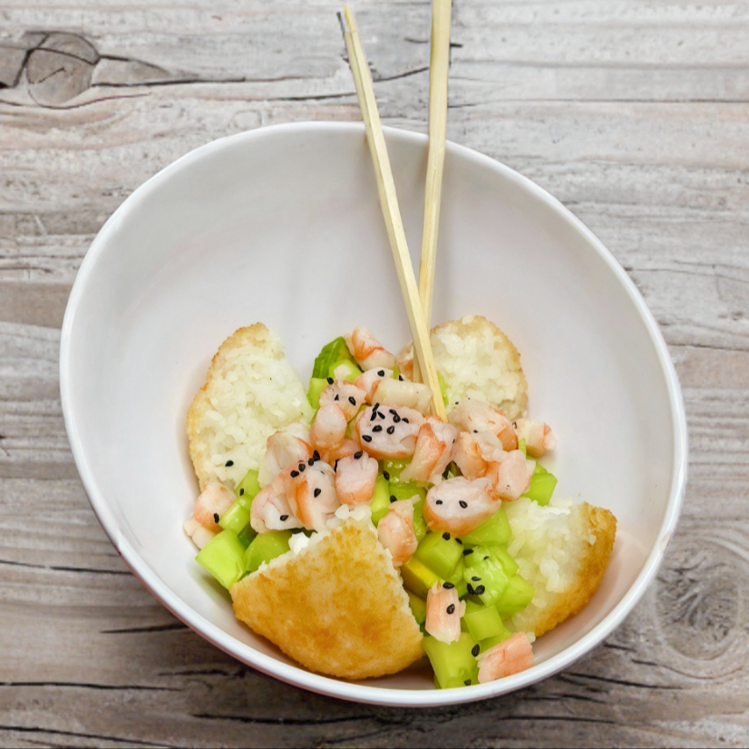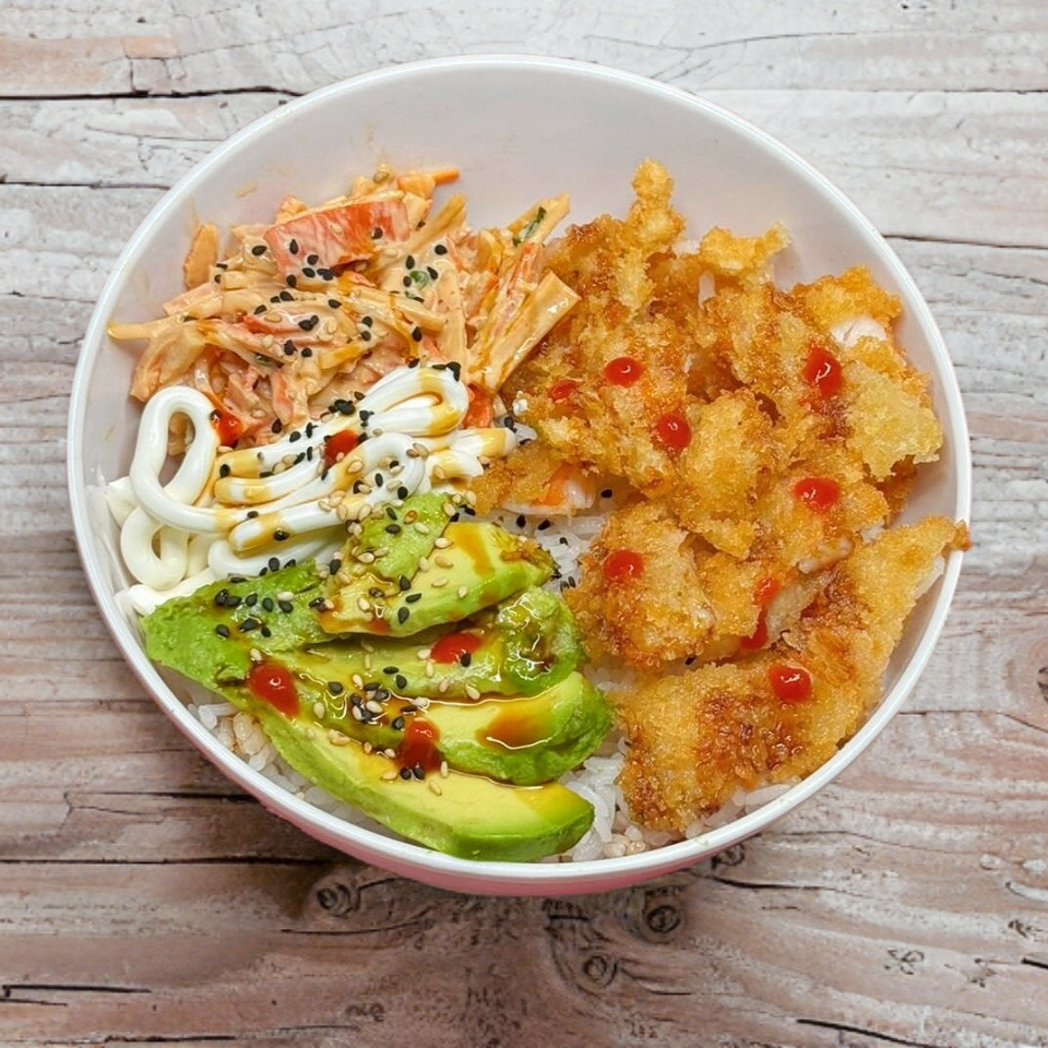 Arroz blanco con camarones empanizados, ensalada de surimi, aguacate y philadelphia, bañados en salsa de anguila con unas gotas de siracha.