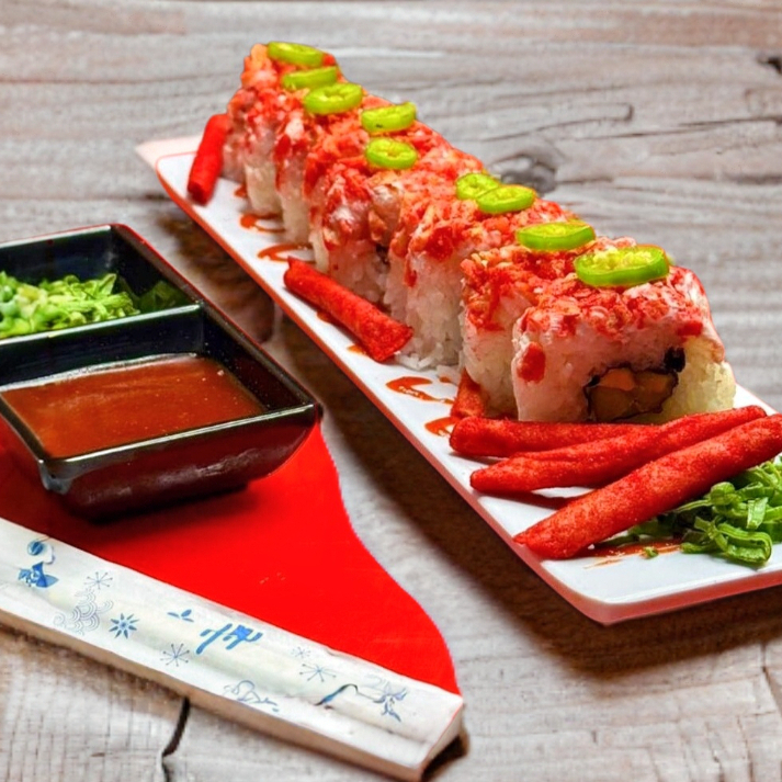 Sushi con aguacate, pepino, philadelphia y camaron por dentro y por fuera forrado de philadelphia con papitas flaming hot molidas, unas rodajas de chile verde y unas pizcas de sishimi.