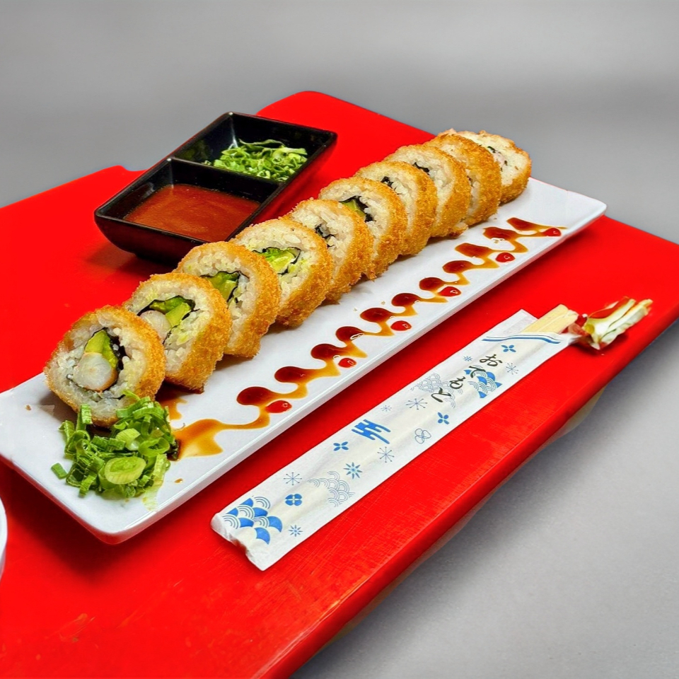 Sushi con aguacate, pepino, philadelphia y camaron por dentro y alga por fuera empanizado.