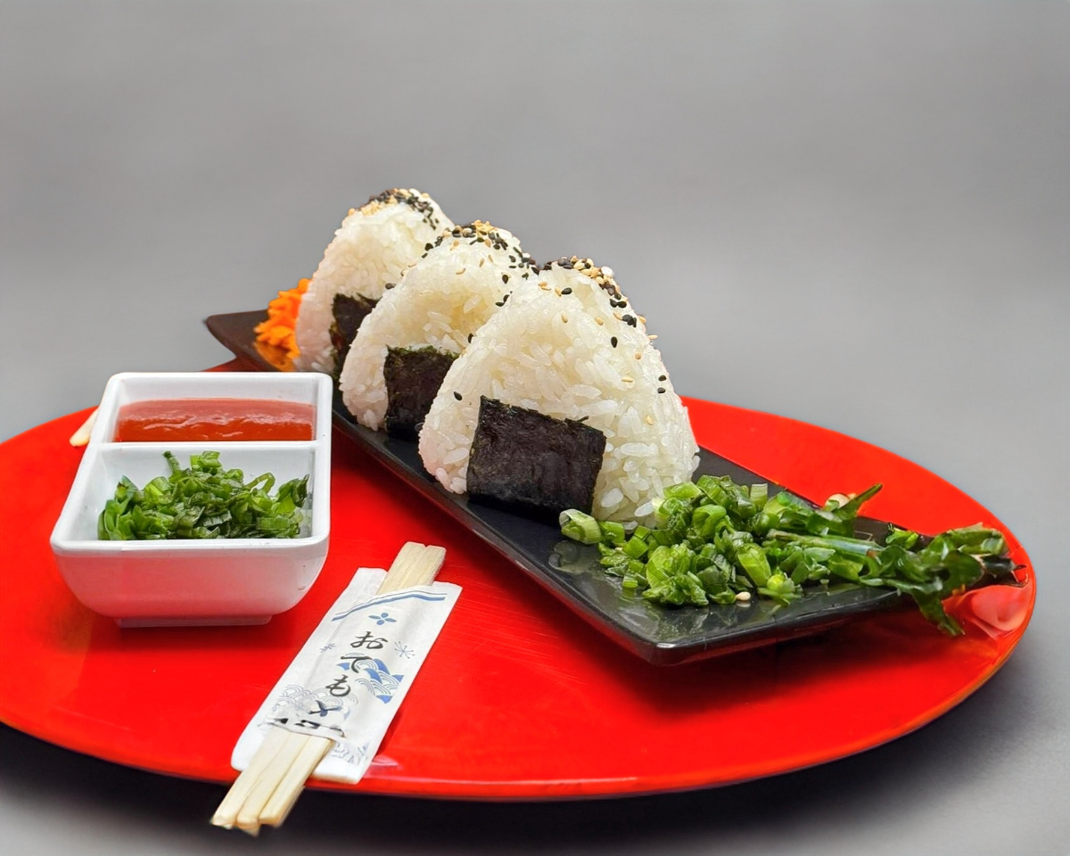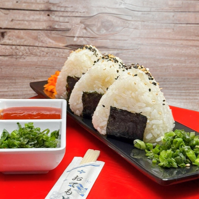 3pz de bolas de arroz cocido con un calzon de alga nori y una pizca de ajonjoli.