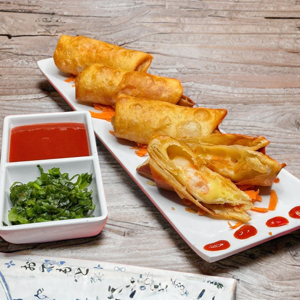 Sushi con aguacate, pepino, philadelphia y camaron por dentro y por fuera forrado con philadelphia, queso amarrillo y queso gouda, empanizado.