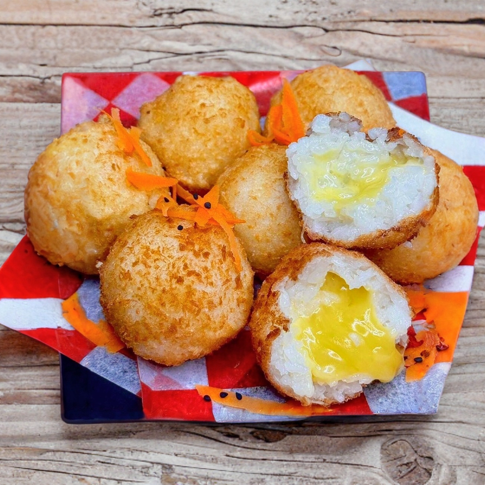 7 bolas de arroz fritas, rellenas con queso gouda.