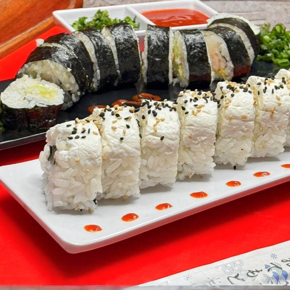 Sushi con aguacate, pepino, philadelphia y camaron por dentro y por fuera mitad empanizado y mitad philadelphia.