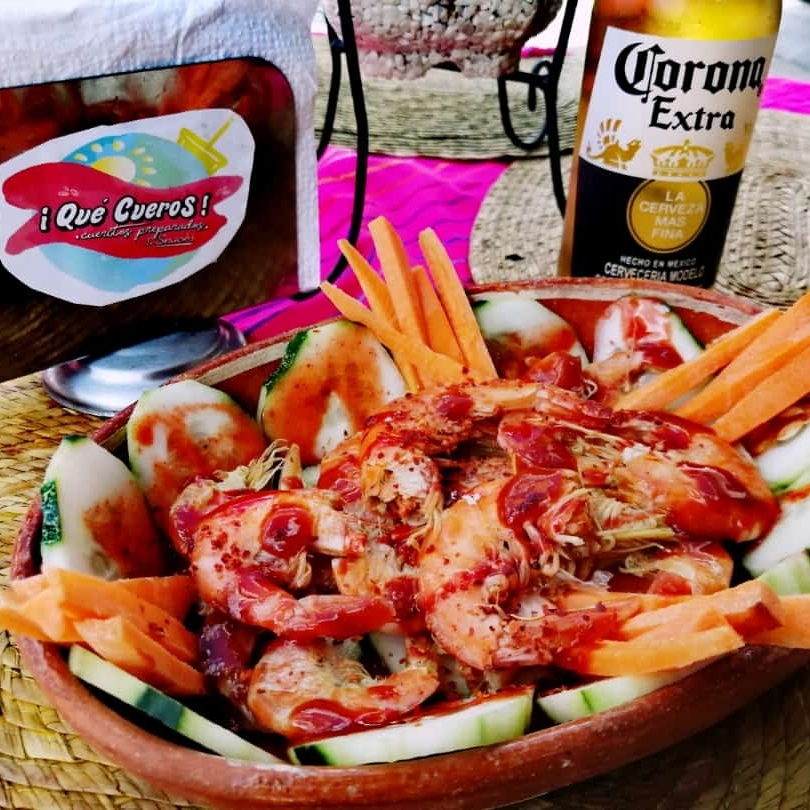 Camarón seco con aderezo de la casa, clamato sal y limón.