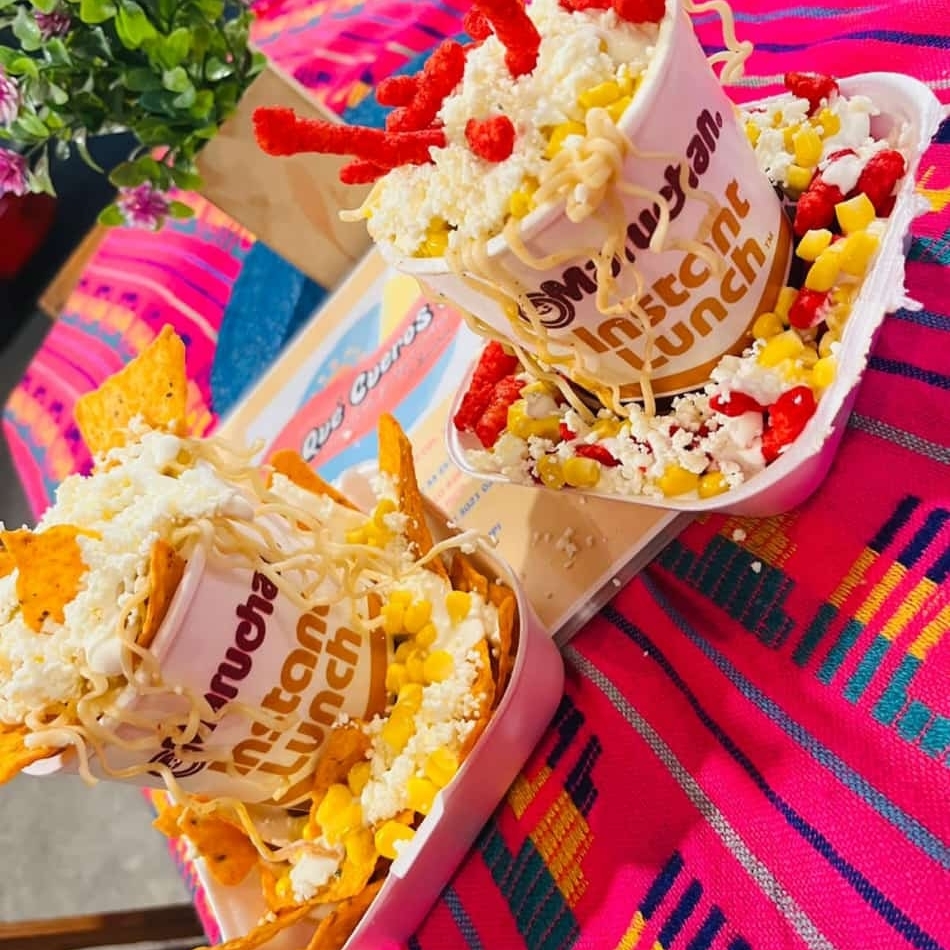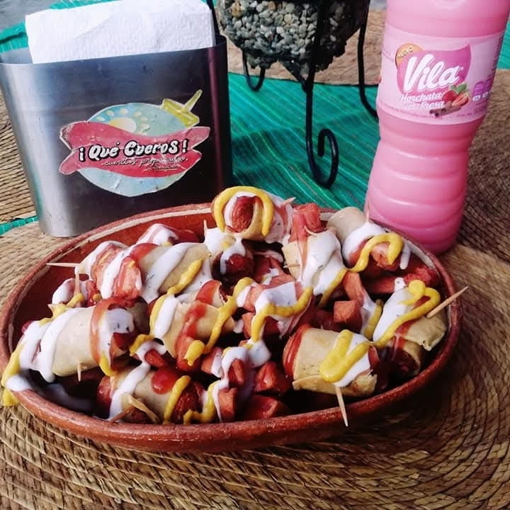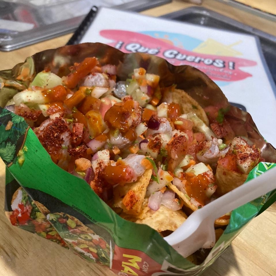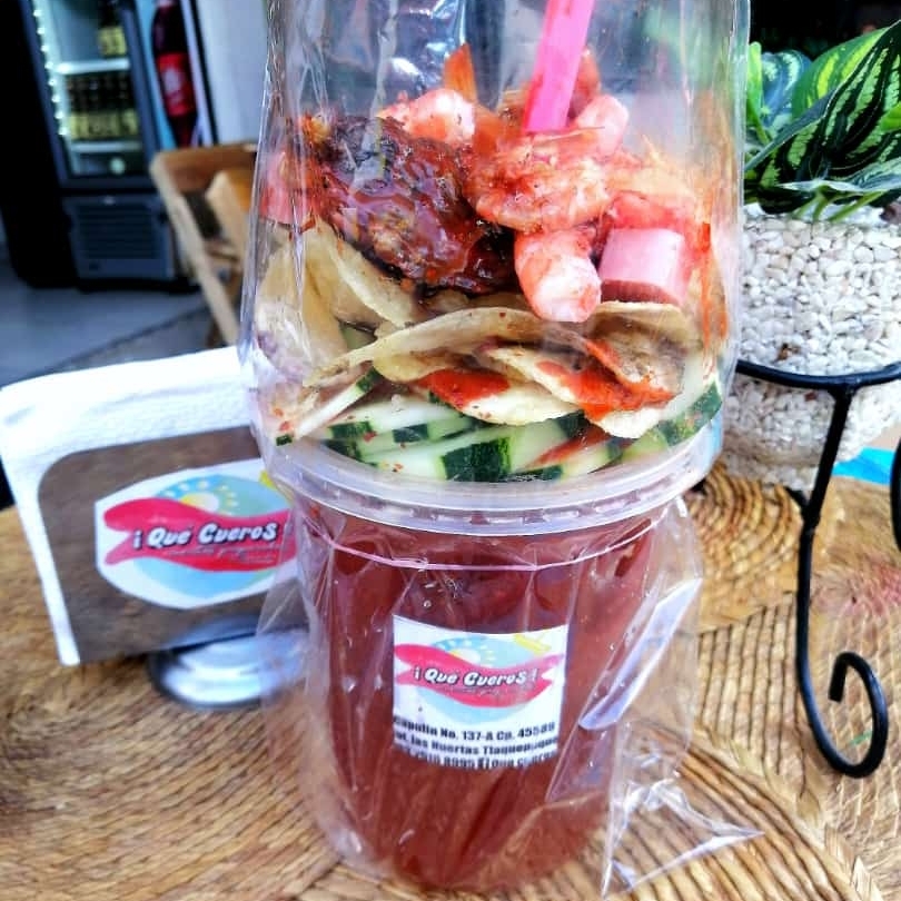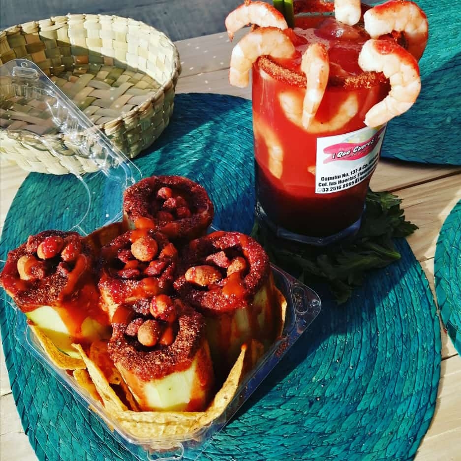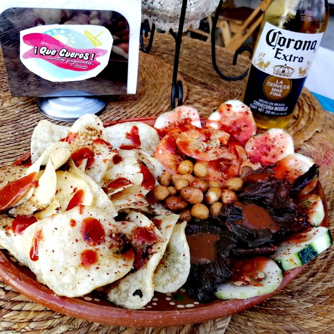Tostitos o Doritos, cuerito preparado, pepino, salchicha, jícama, pepino, cacahuate, rielitos, clamato, salsas y más.