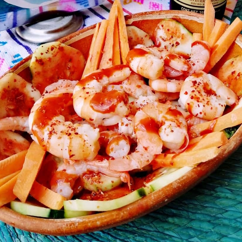Botana preparada con camarón seco y fresco, cecina, cuerito preparado, salchicha, cacahuate, jícama, pepino, salsas, clamato y más.