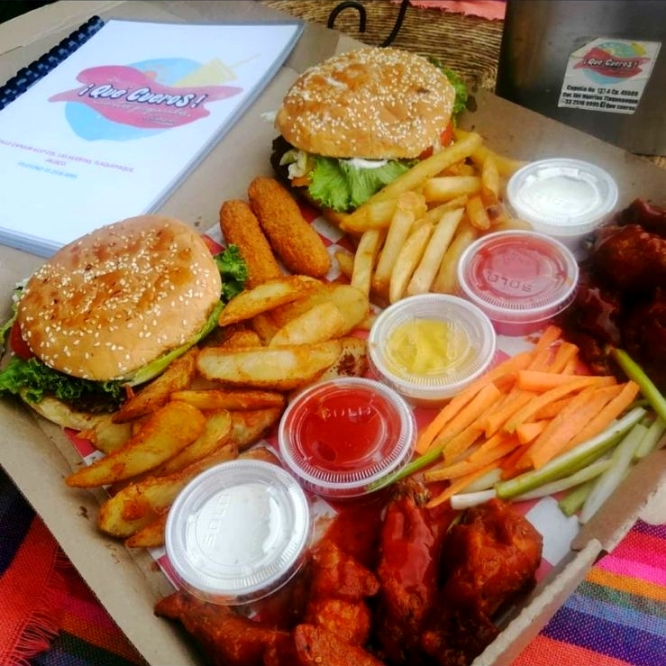 2 Hamburguesas de res, papas gajo, papa francesa, dedos de queso y 10 alitas
