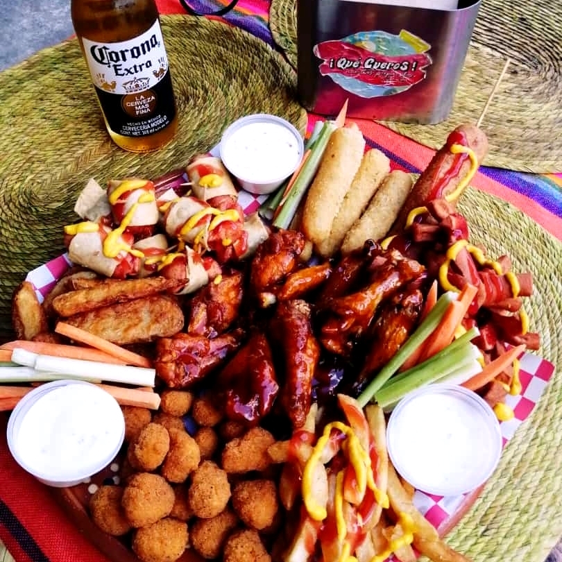 10 Alitas, 4 dedos de queso, papas francesa, papas gajo, salchipulpo, salchitaco, 2 mini banderillas, palomitas de pollo, vegetales y aderezo.