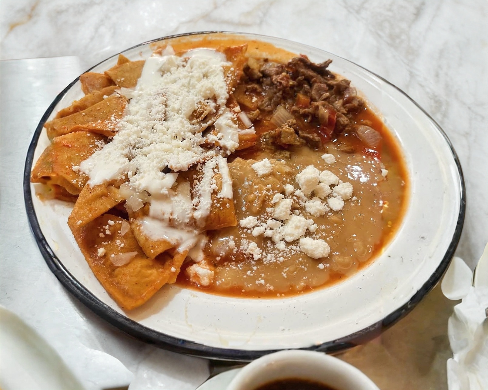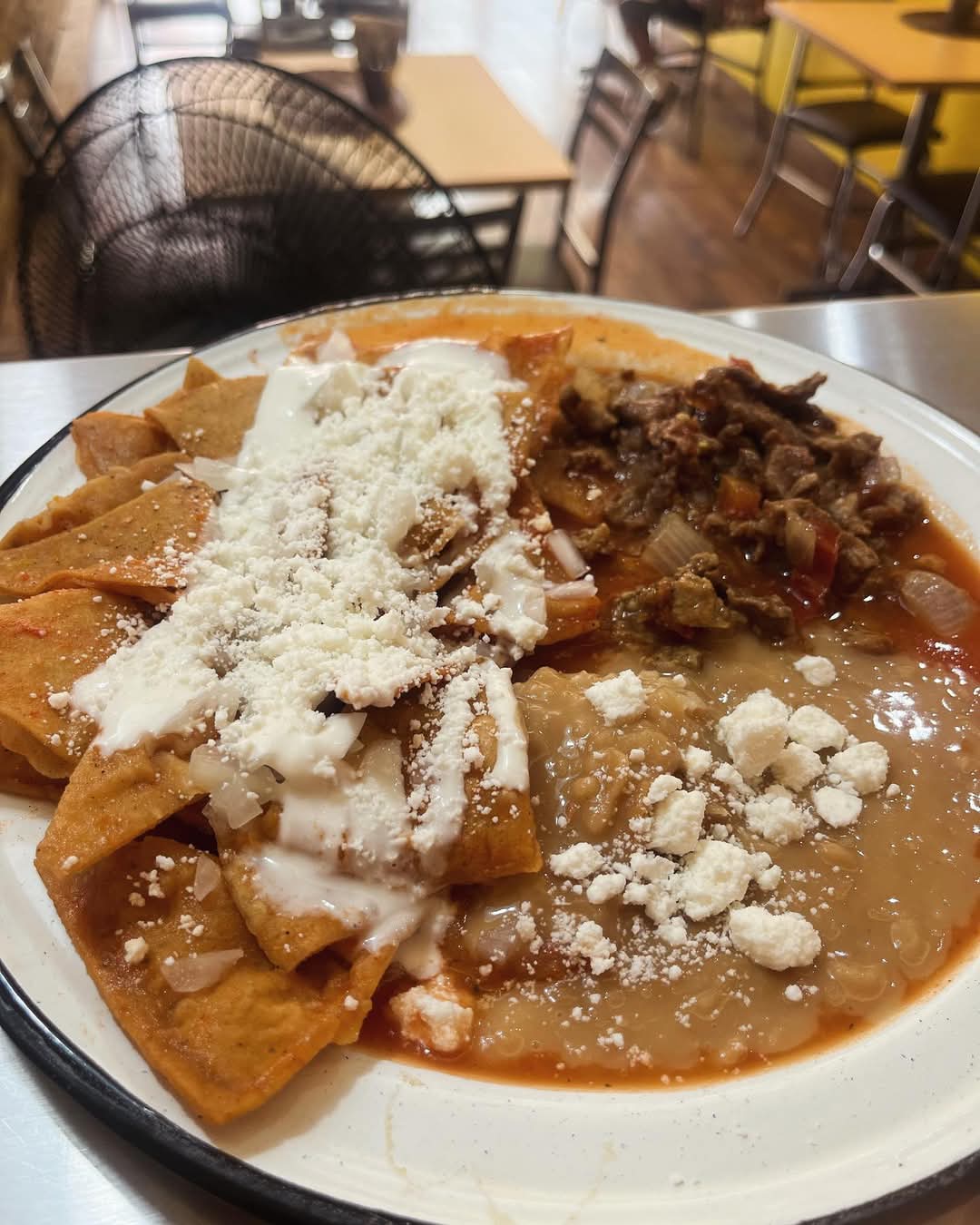 Chilaquiles con tu guiso favoritos y frijoles. Incluye tortilla y/o bolillo.