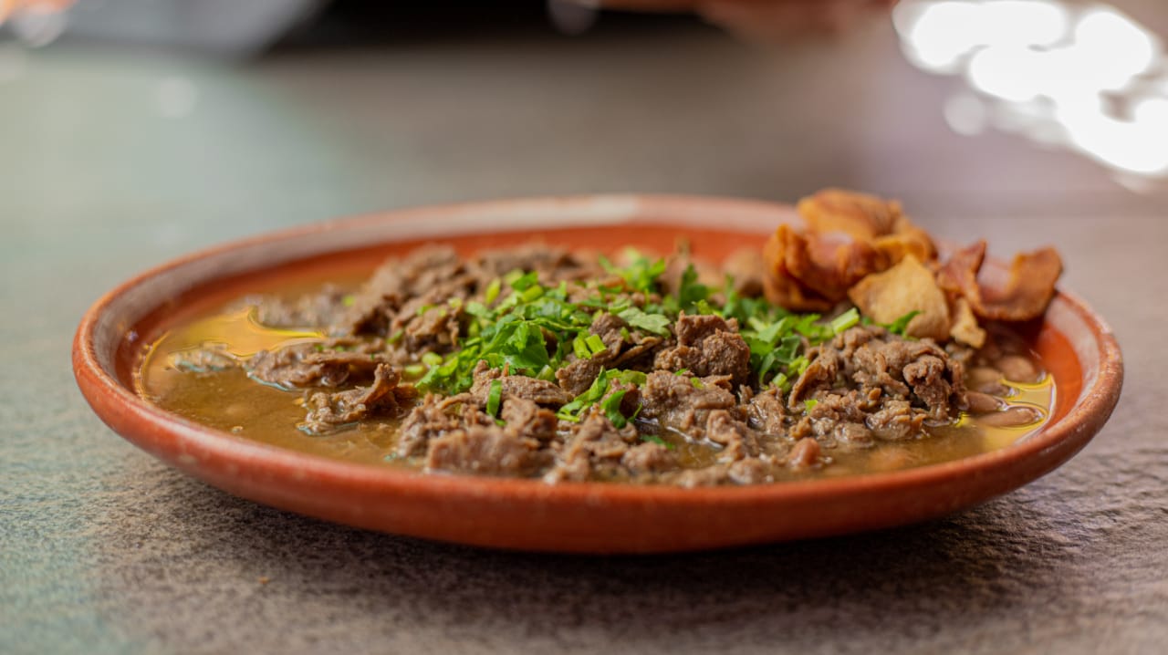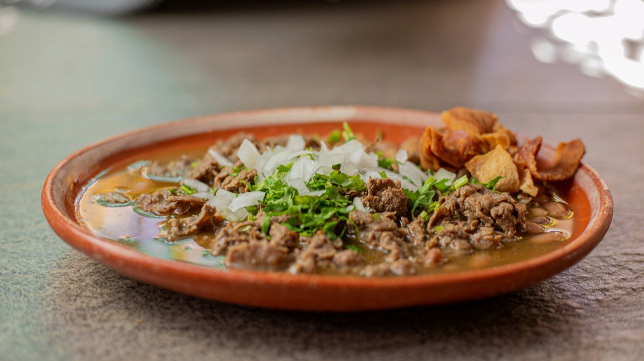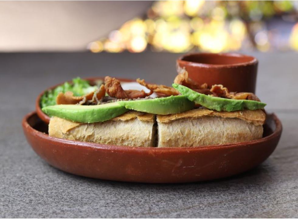Ingredientes de carne en su jugo, dentro de un crujiente birote con cama de frijoles con elote y aguacate