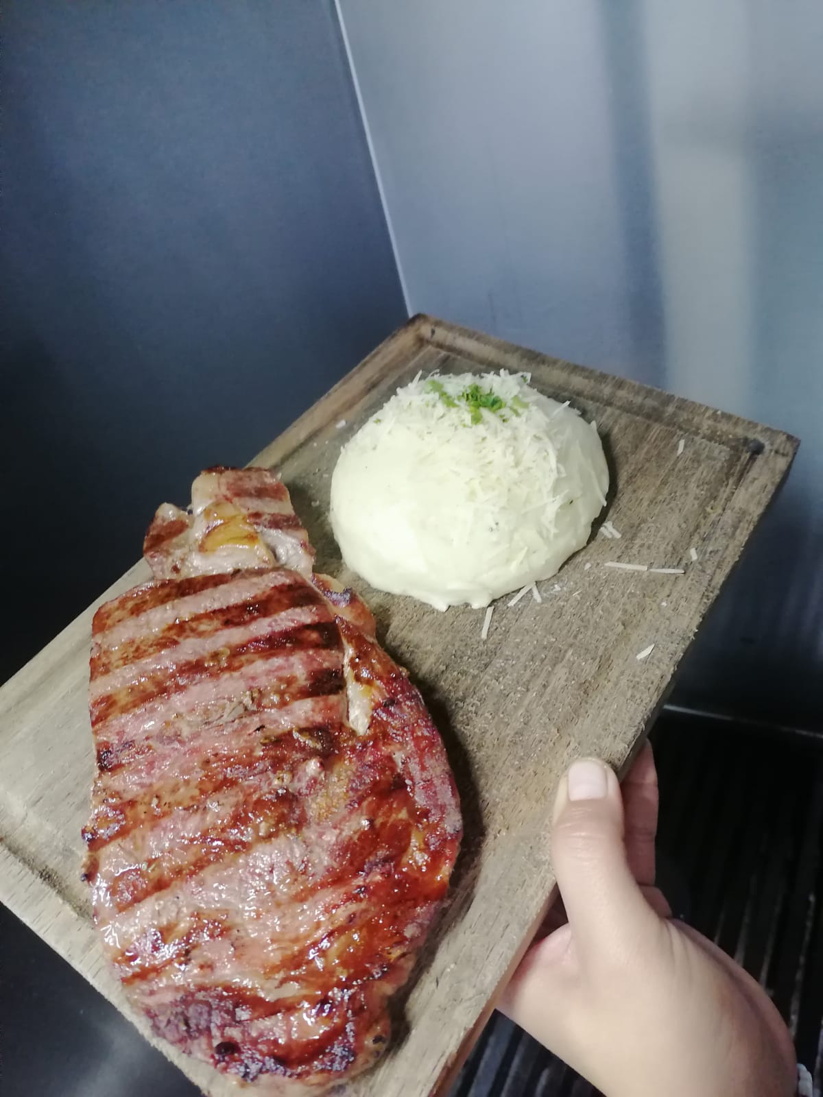 400 gr. Con una guarnición a elegir puré de papa, ensalada o elote asado.