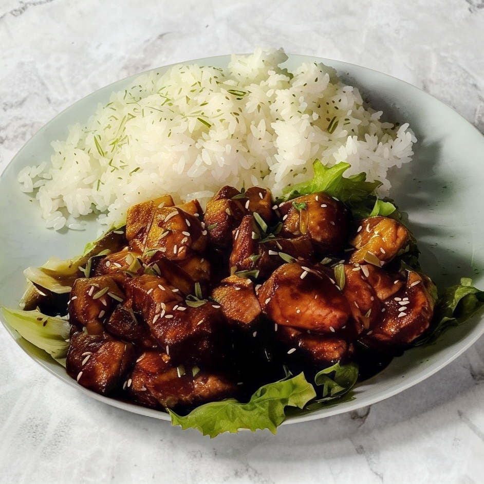 Pollo frito bañado con una salsa agridulce con un ligero toque picoso e incluye arroz frito