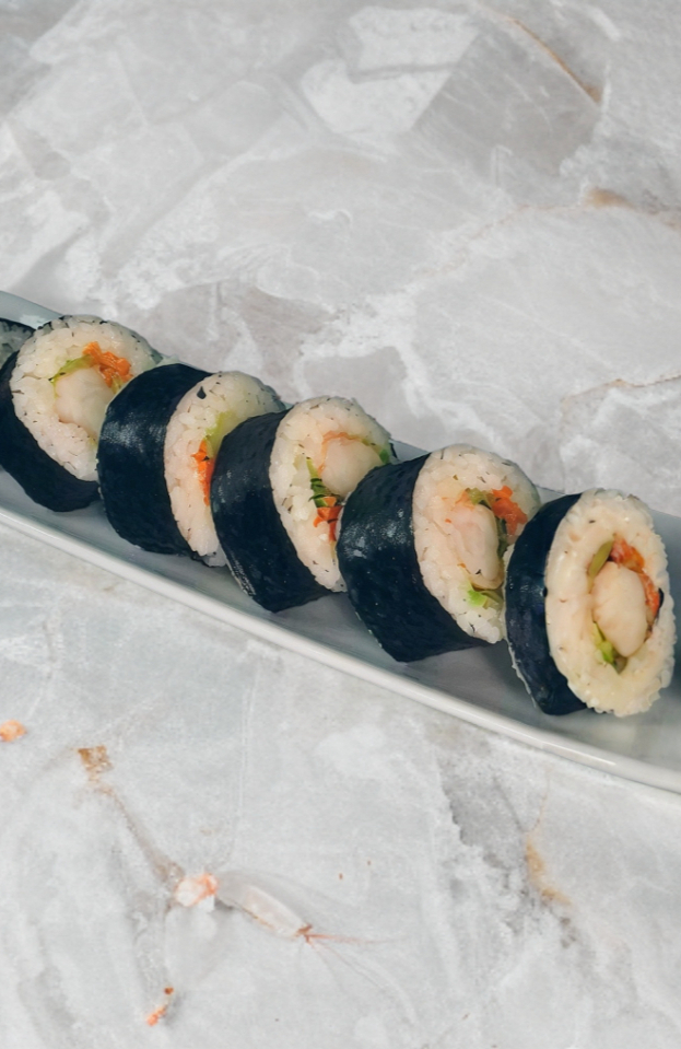 8 rollos gruesos rellenos de atún, salmón, pulpo y camarón, además de verduras vueltas en alga