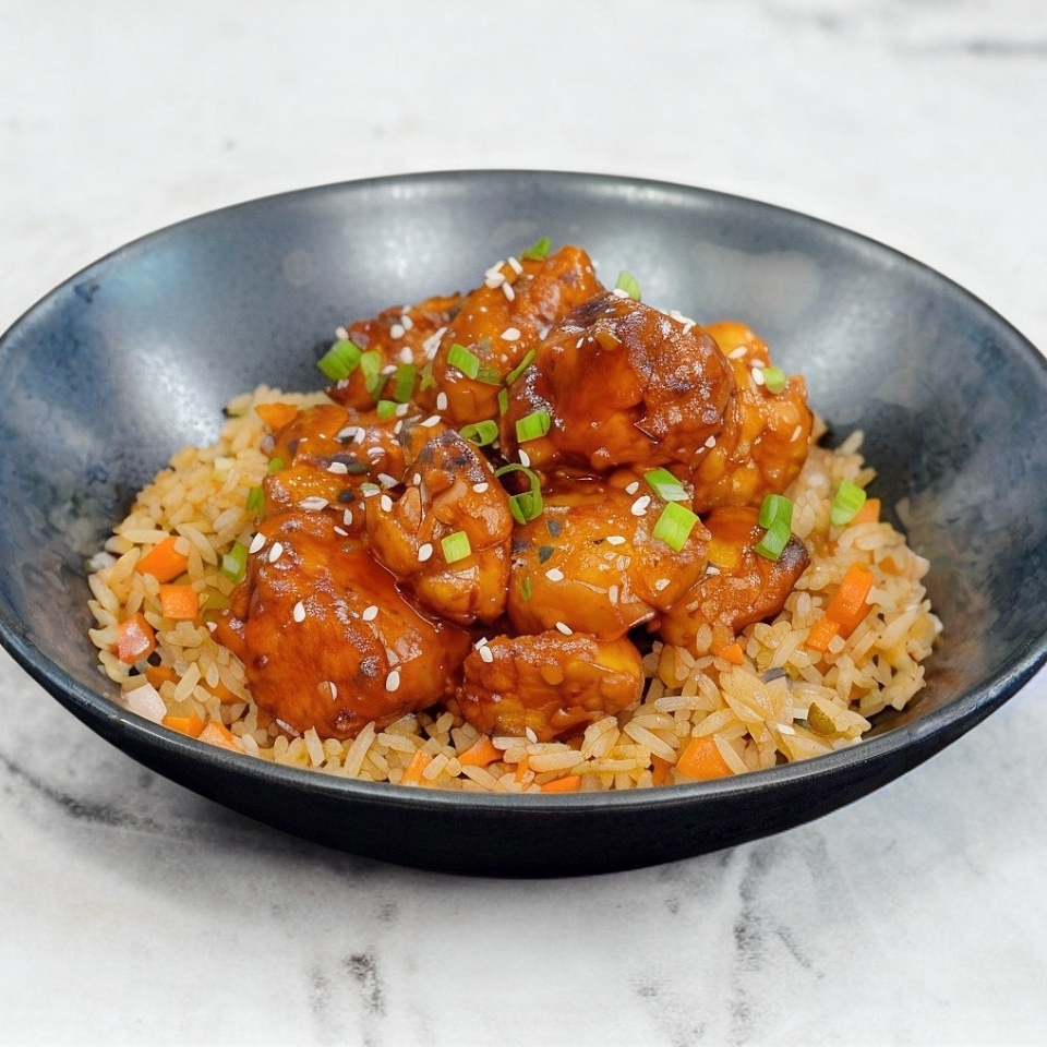 Pollo frito bañado con una salsa agrídulce estilo japonés e incluye arroz frito