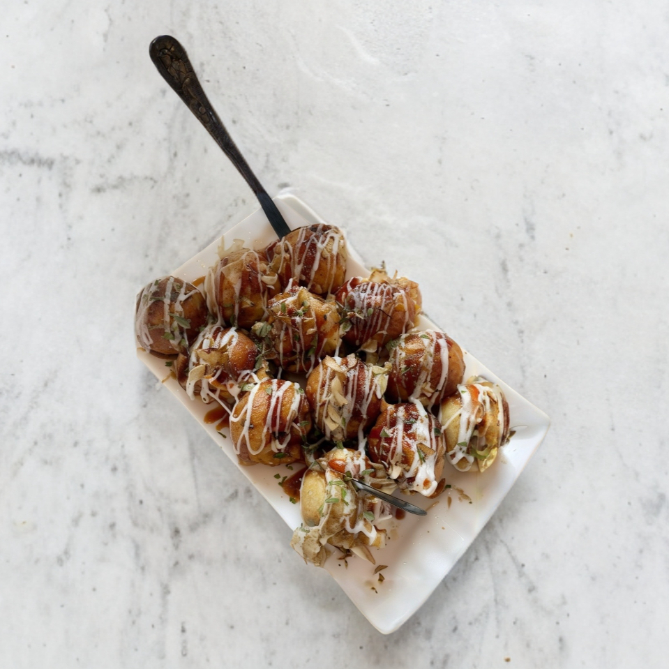 10pzs. Bolitas de masa frita rellenas de pulpo bañadas en una salsa y mayonesa japonesa