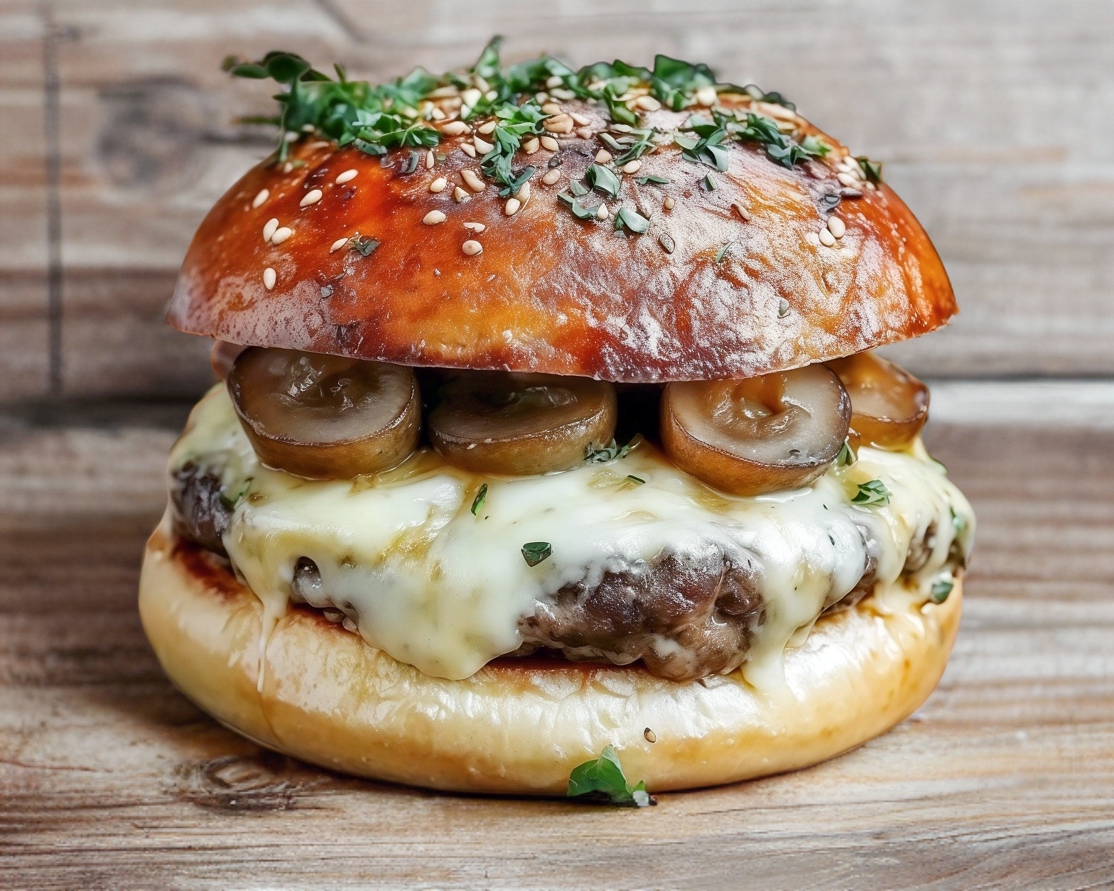 carne de res champiñones frescos cebolla caramelizada lechuga jitomate y pan brioche crema salsa catsup acompañada de papas ala francesa.