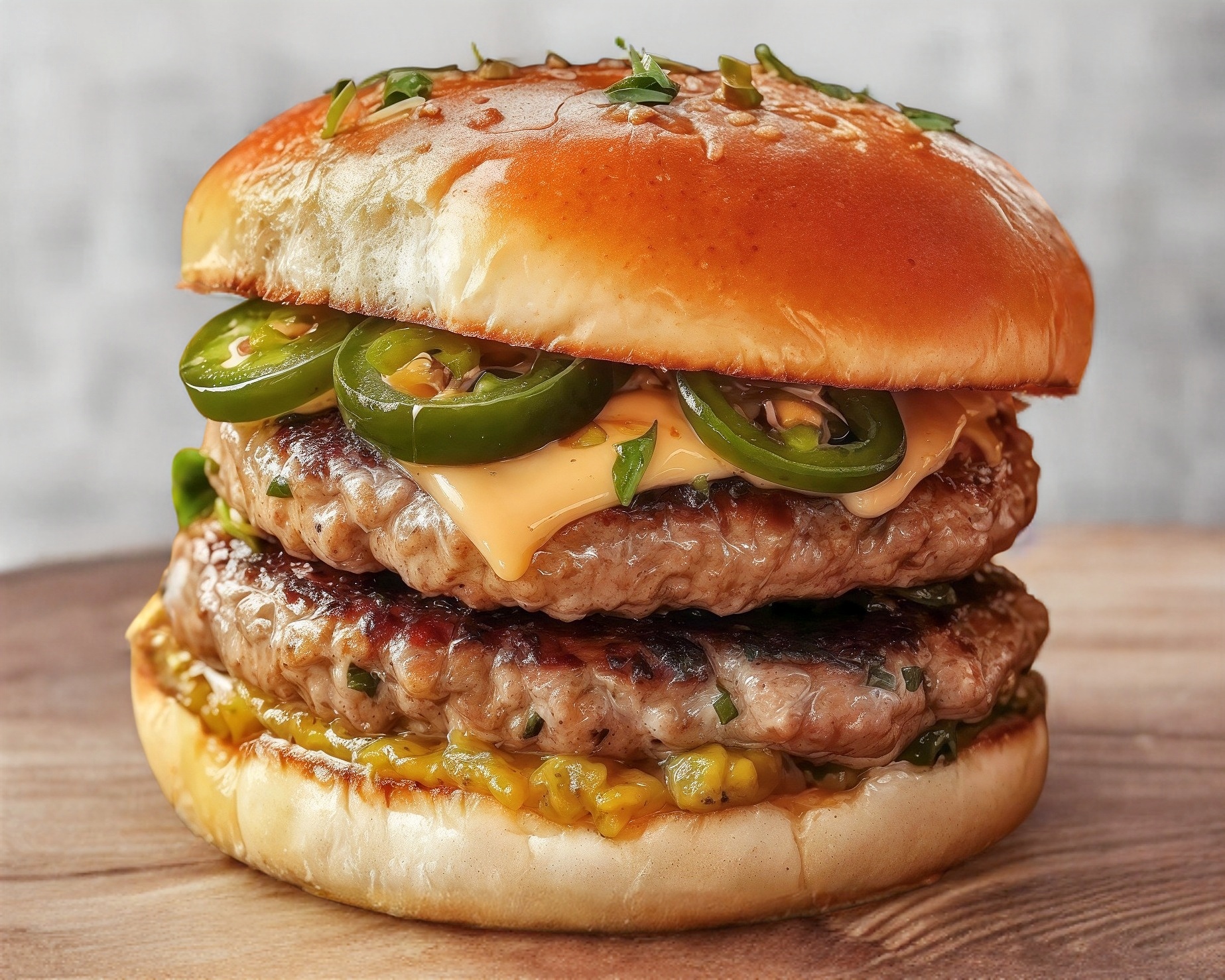 doble carne de res jalapeñocebolla queso americano sal pimienta negra crema salsa catsup acompañada de papas ala francessa.
