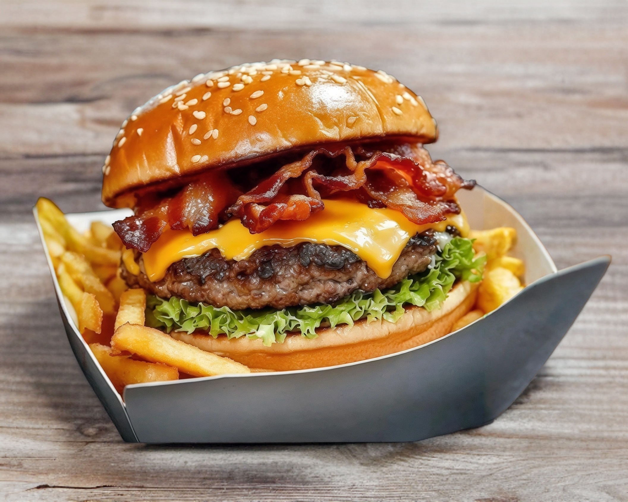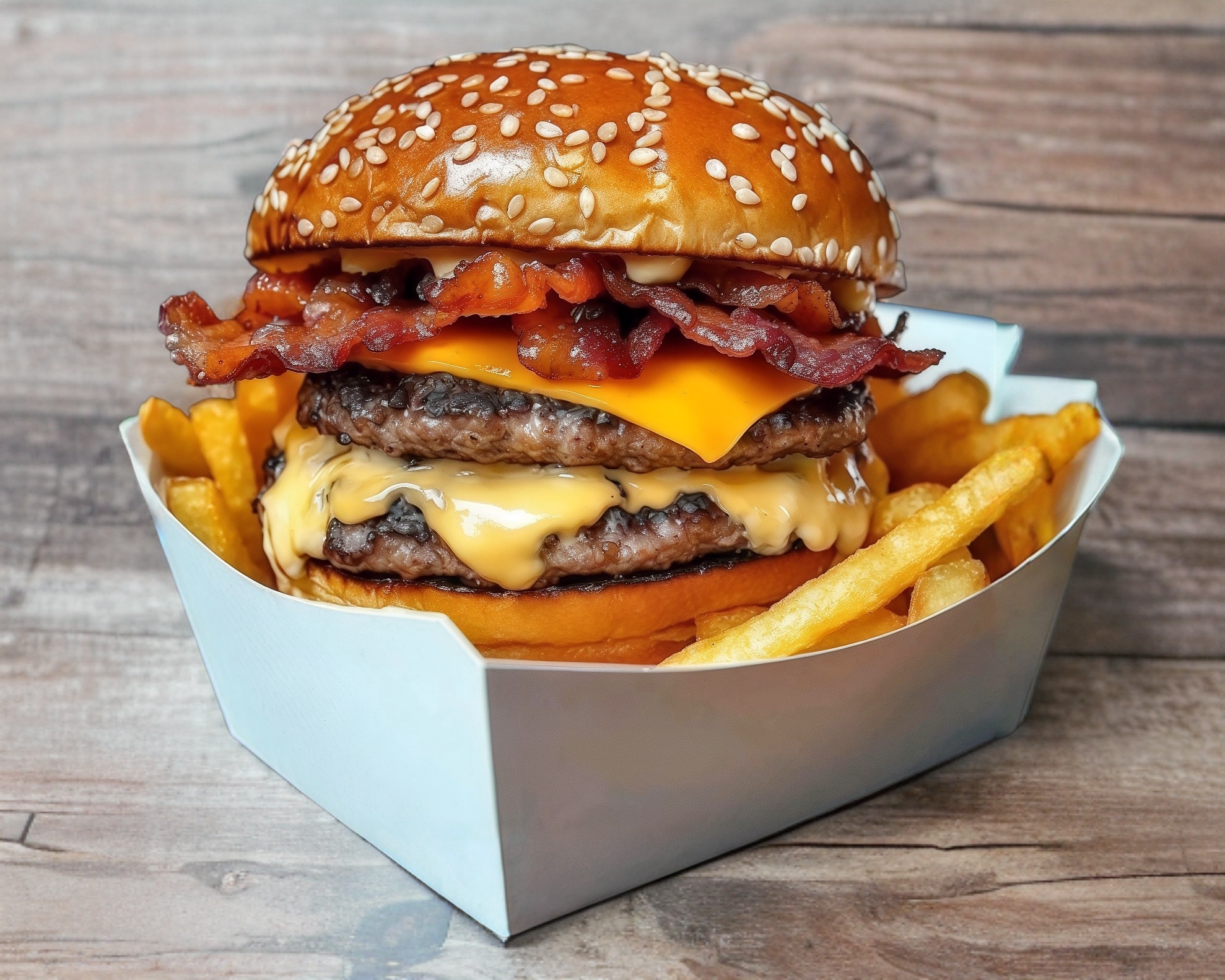 doble carne de res tocino dorado queso americano jitomate cebolla lechuga crema catsup acompañada de papas ala francessa