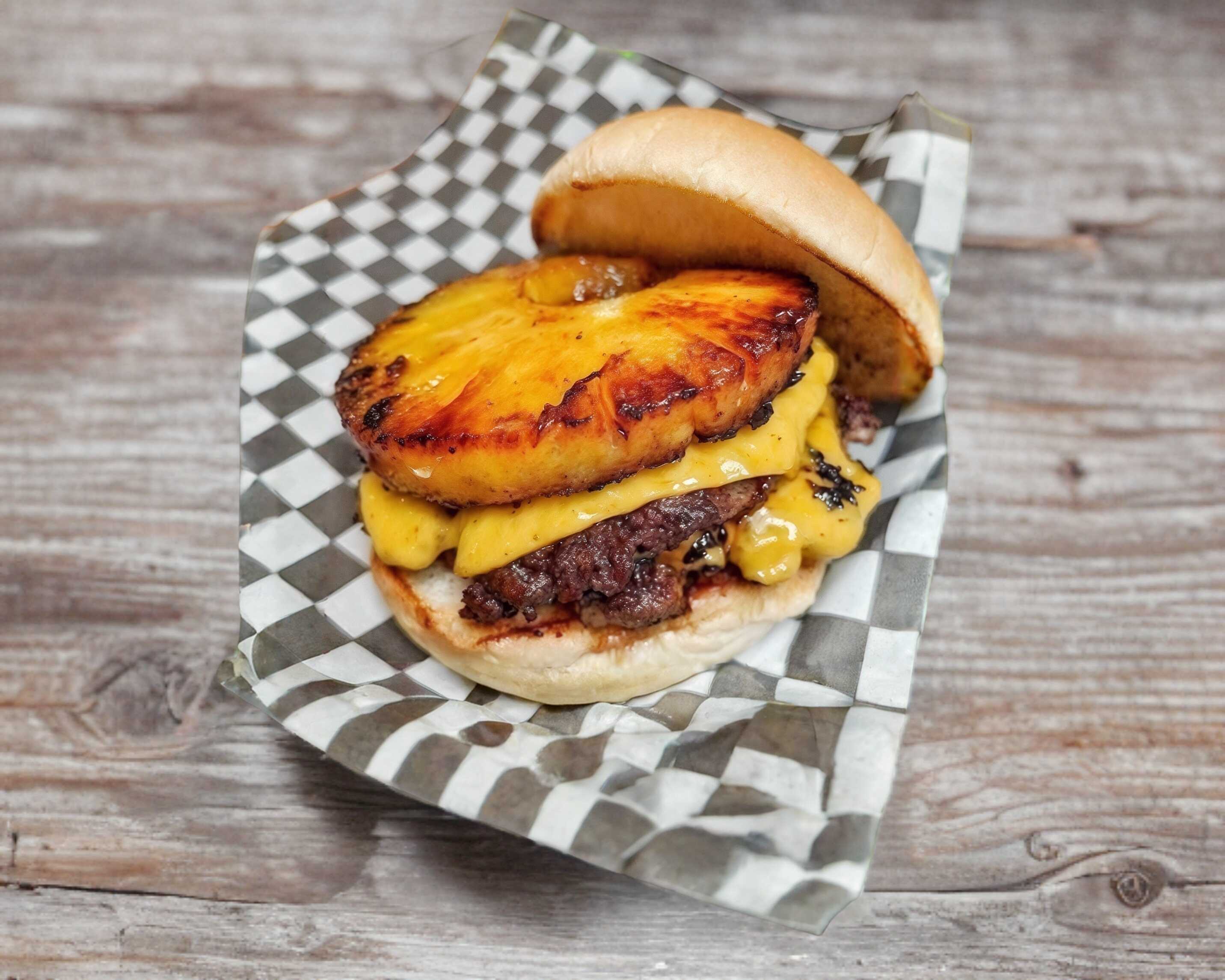 carne de res piña caramelizada queso americano crema salsa catsup lechuga jitomate cebolla acompañada de papas ala francessa.