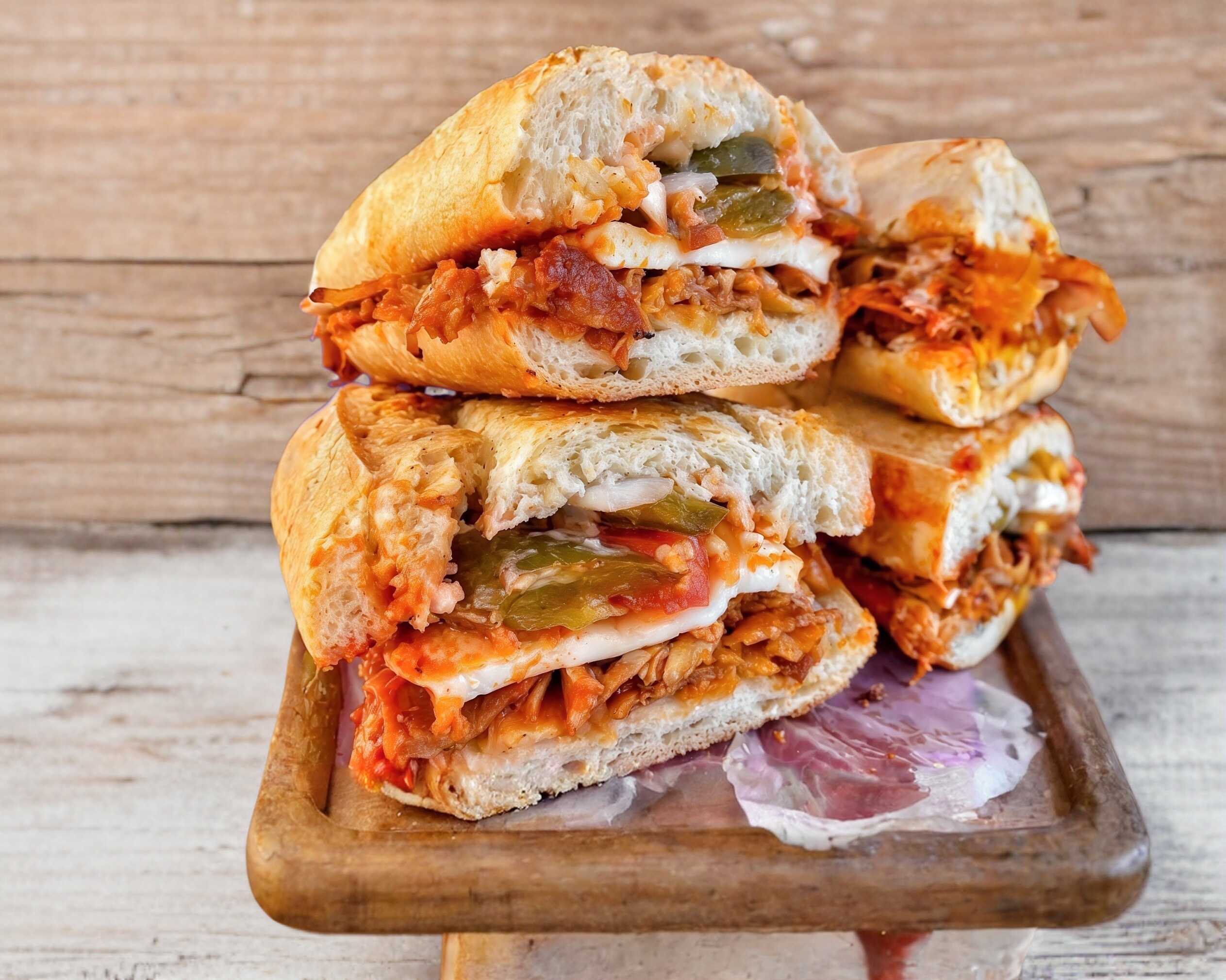 Lonche de milanesa de pollo empanizado acompañado de lechuga jitomate cebolla catsu crema mayonesa chiles jalapeño
