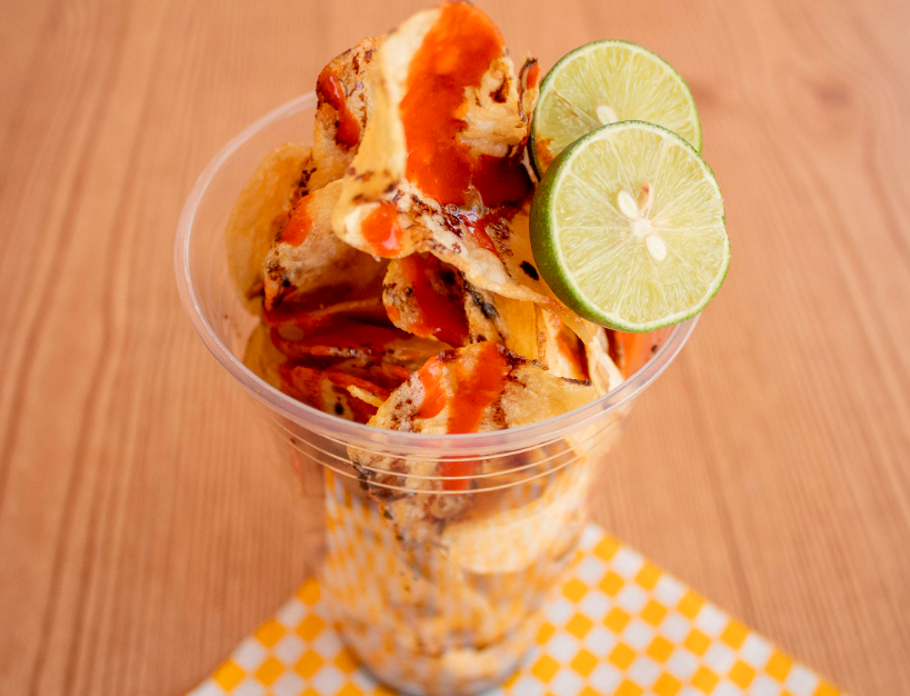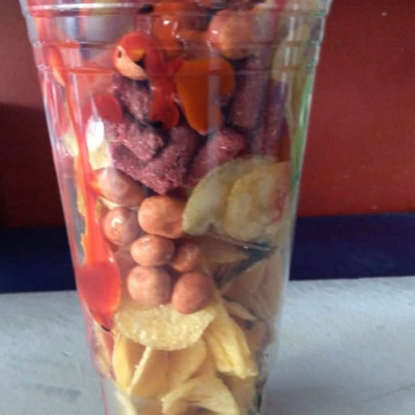 Sal,limón,chile valentina o Yahualica,maggi y salsa inglesa, cacahuates,rielitos,jícama,pepino, salchicha,cueritos