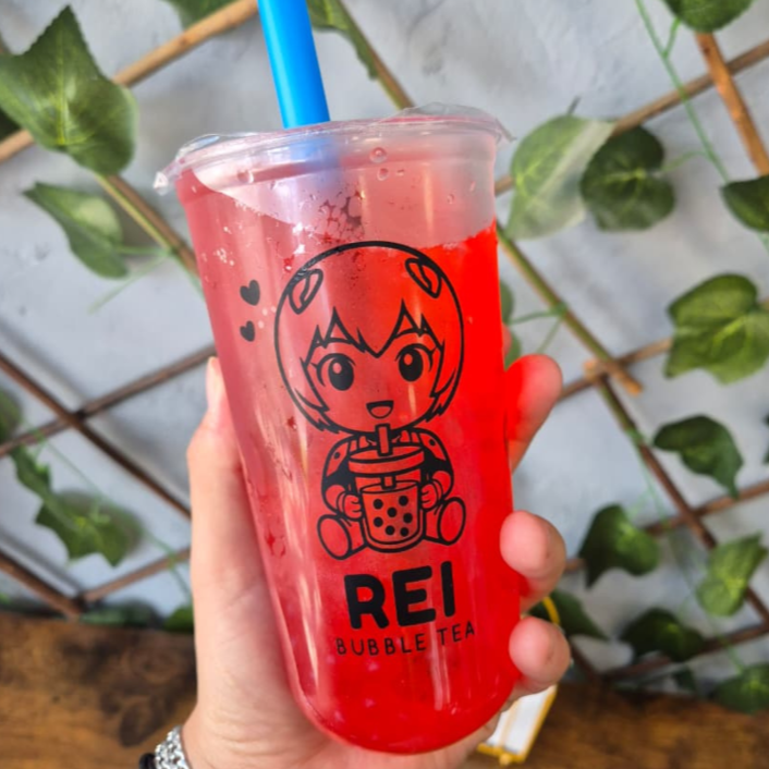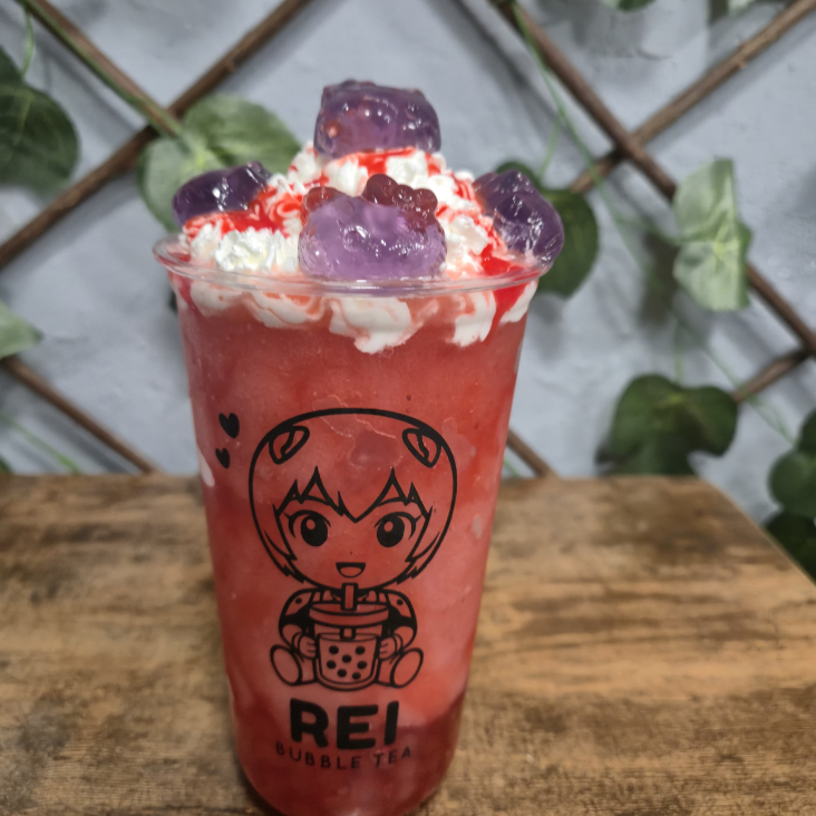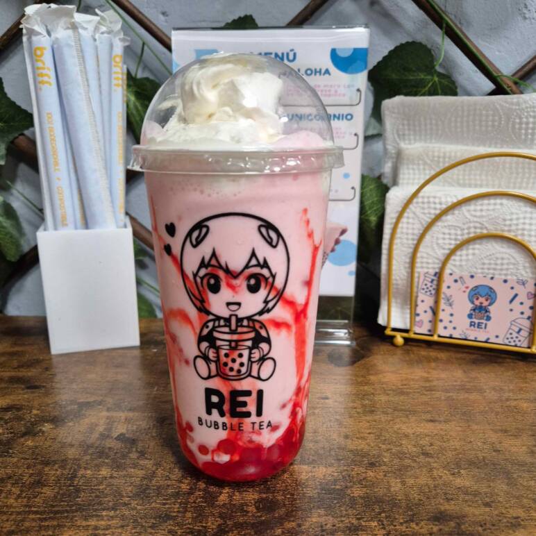 Smothie sabor fresa con Jellys especiales de hello kitty, fresas naturales, perlas explosivas de fresa, y crema batida.