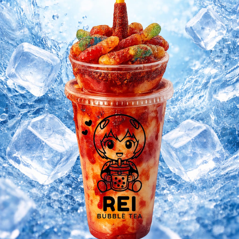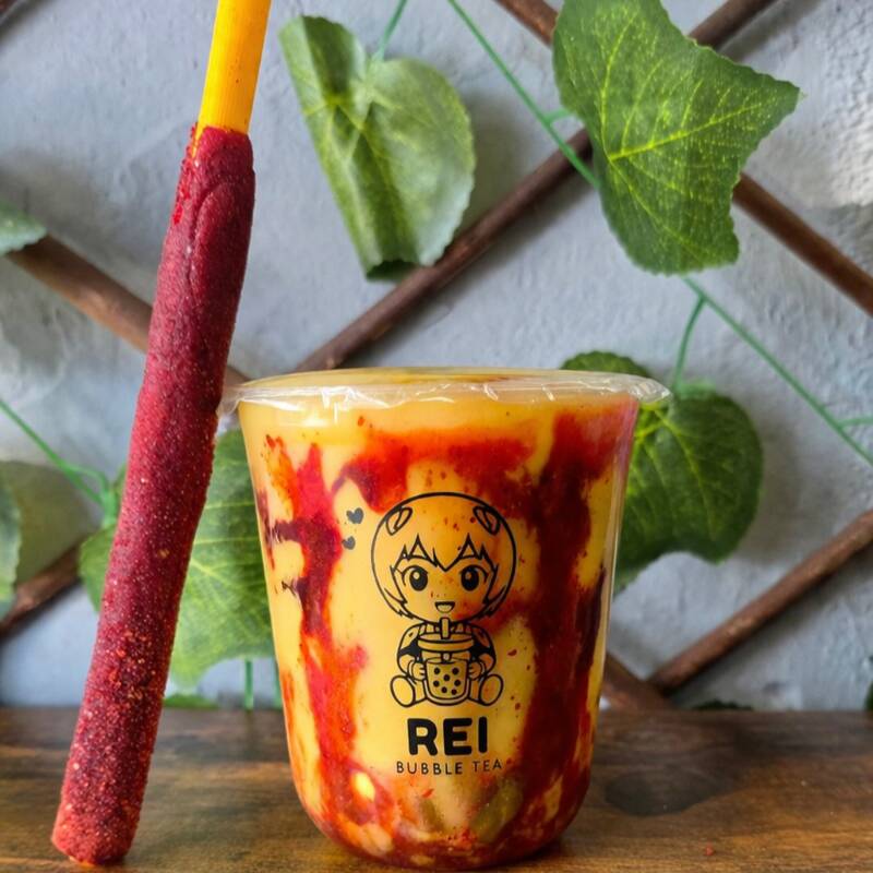 Smothie de 12oz sabor mango a base de agua, con chamoy, tajín y un extra de perlas sabor manzana con kiwi con una banderilla de tamarindo al cambiar el tamaño a mediano o grande