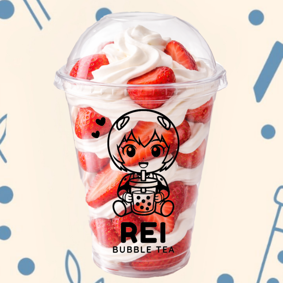 Frappe de 16oz sabor fresa, a base de leche, perlas explosivas de fresa, crema batida, y mermelada de fresa.