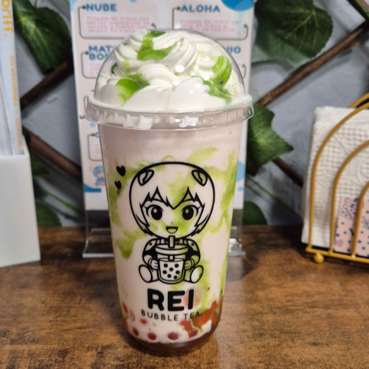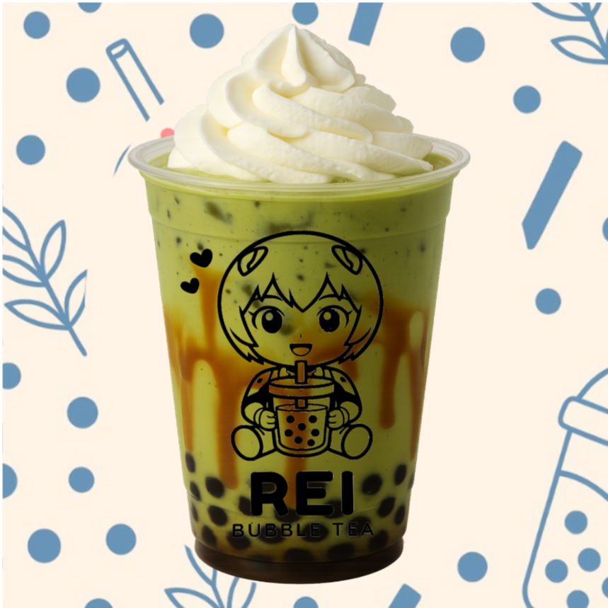 Frappe 16oz de matcha a base de leche, con crema batida, cajeta y perlas de tapioca.